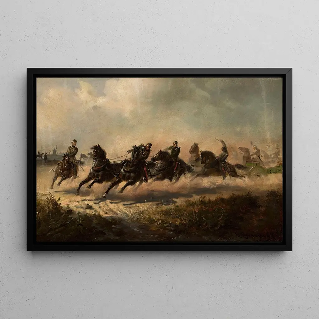 Maksymilian Gierymski, peintre polonais du XIXe siècle, est connu pour ses œuvres militaires et historiques. Influencé par le romantisme, il s'intéresse particulièrement aux thèmes de la guerre et de la bravoure. Sa carrière est marquée par une volonté de représenter les événements marquants de son époque, notamment les luttes pour l'indépendance de la Pologne. "Charge d'Artillerie" est un exemple emblématique de son style, où il mêle réalisme et dramatisation pour transmettre l'impact émotionnel des batailles. Gierymski, à travers ses œuvres, nous rappelle l'importance de la mémoire collective et du sacrifice.