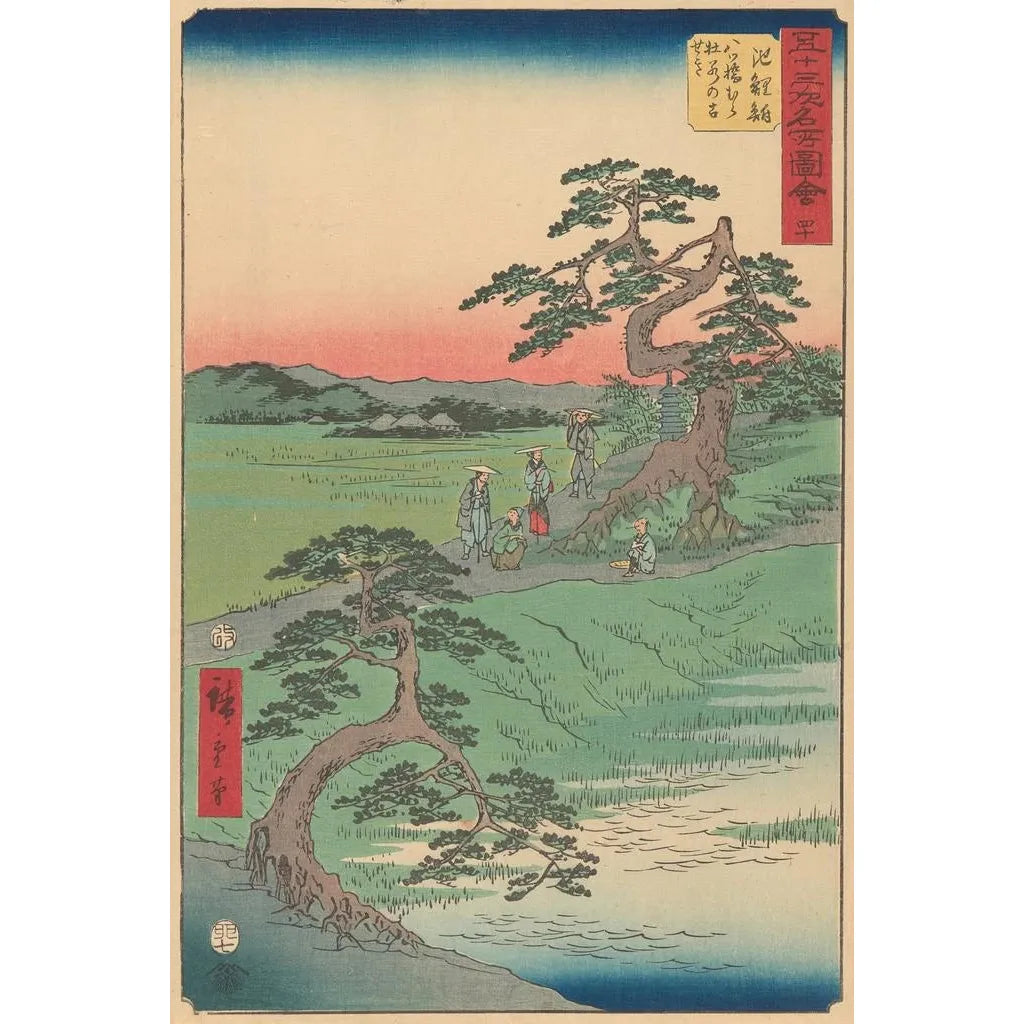 "Chiriu" av Andō Hiroshige är ett konsttryck som fångar den flyktiga skönheten i den japanska naturen. Denna duk, rik på detaljer, visar ett landskap där blommornas ömhet och flödet i floderna smälter samman i harmoni. Pastellfärger, typiska för den japanska ukiyo-e, skapar en atmosfär av lugn och frid. Hiroshige, mästare av ukiyo-e, använder trägraveringstekniker för att göra varje element levande och inbjuder betraktaren att fördjupa sig i detta poetiska och kontemplativa konsttryck.