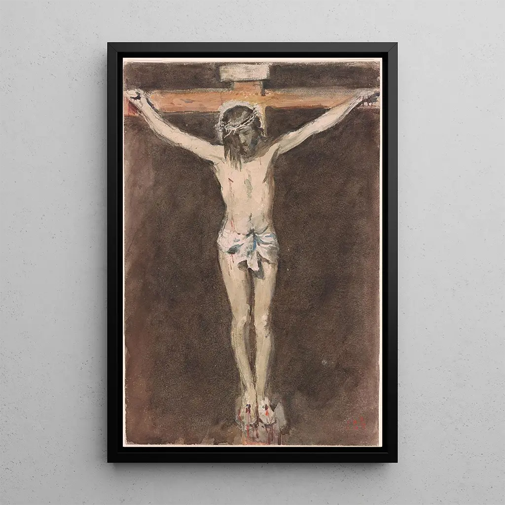 Konsttrycket av Christ på korset är ett verk som fångar med sin emotionella intensitet. Denna målning, med sina mörka färger och tydliga kontraster, framkallar smärta och försoning. Konstnärens teknik, som blandar skuggor och ljus, skapar en dramatisk atmosfär som omedelbart drar blickarna till sig. Kristi kropp, hängande mellan himmel och jord, förkroppsligar både mänskligt lidande och gudomlig hopp, och inbjuder betraktaren till reflektion över tro och offer.