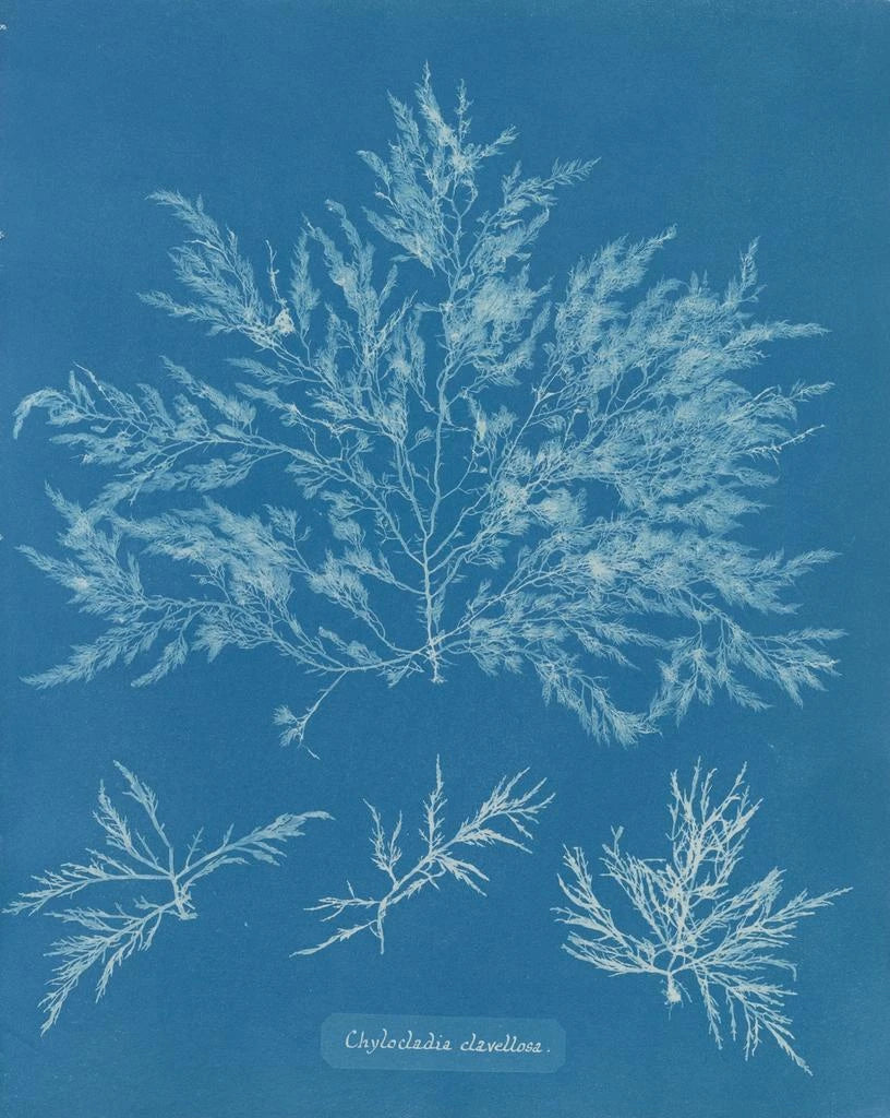 I den fascinerande världen av botanisk konst utmärker sig "Chylocladia clavellosa" av Anna Atkins genom sin delikata skönhet och sin innovativa metod. Det är det första exemplet på ett fotografiskt verk med vetenskaplig avsikt, och detta stycke förenar konst och vetenskap genom att avslöja skönheten hos marina alger med hjälp av cyanotypeteknik. Anna Atkins, en pionjär inom användningen av denna process, lyckades fånga naturens essens med en precision och känslighet som går bortom en enkel visuell registrering. Denna konsttryck bjuder in oss att dyka in i en värld där natur och konst vävs samman, vilket väcker en omättlig nyfikenhet för livets under.