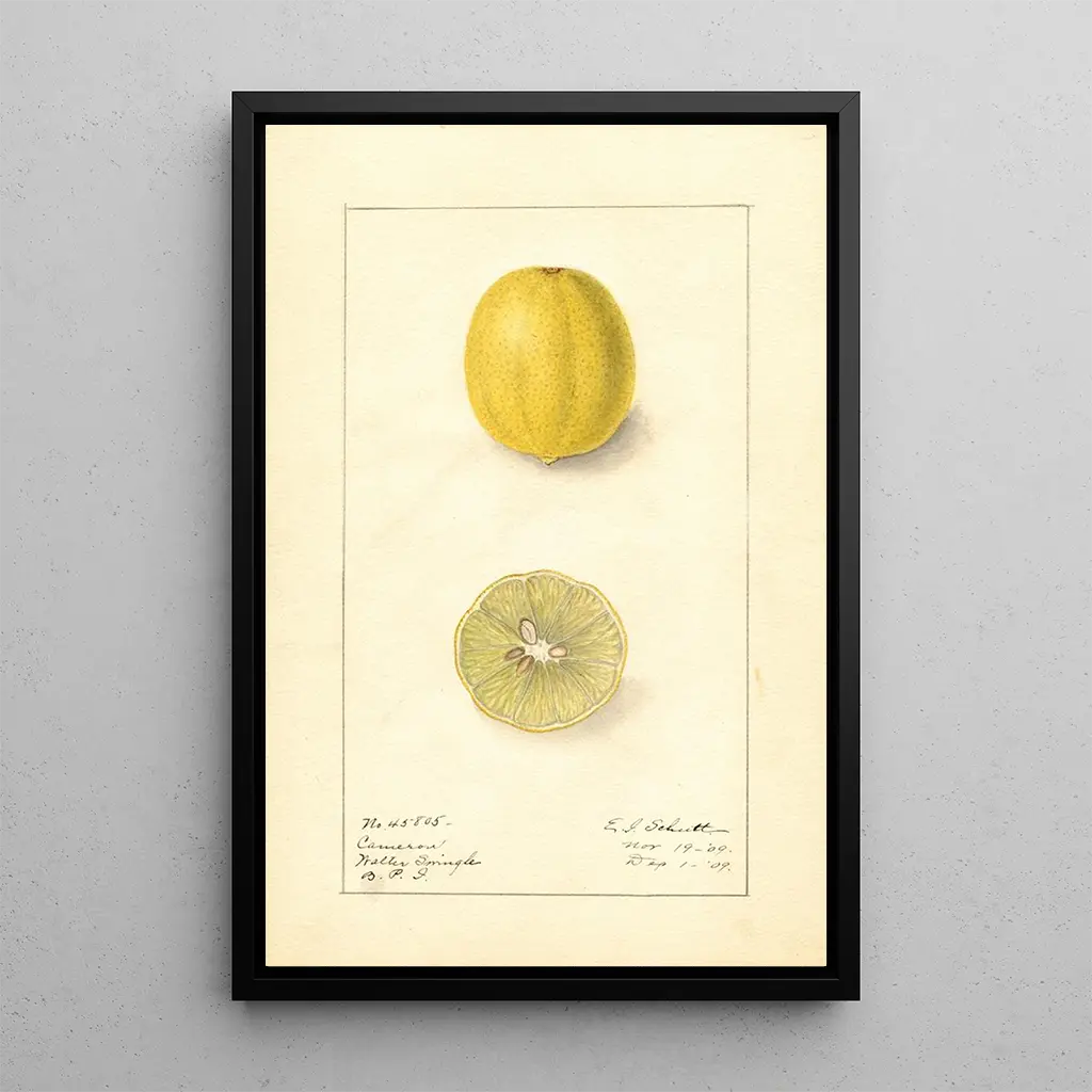 Konsttrycket av Citrus aurantiifolia, signerad av Ellen Isham Schutt, är en verklig hyllning till citrusfrukter. De livfulla nyanserna av gult och grönt flätas samman för att skapa en dynamisk komposition som framkallar friskhet och vitalitet. Konstnären använder en akvarellteknik som möjliggör att fånga ljuset och texturen hos frukterna med stor finhet. Detta verk, fullt av liv, förflyttar betraktaren till ett soligt fruktträdgård, där citrussmaker blandas med den visuella skönheten av de strålande färgerna.