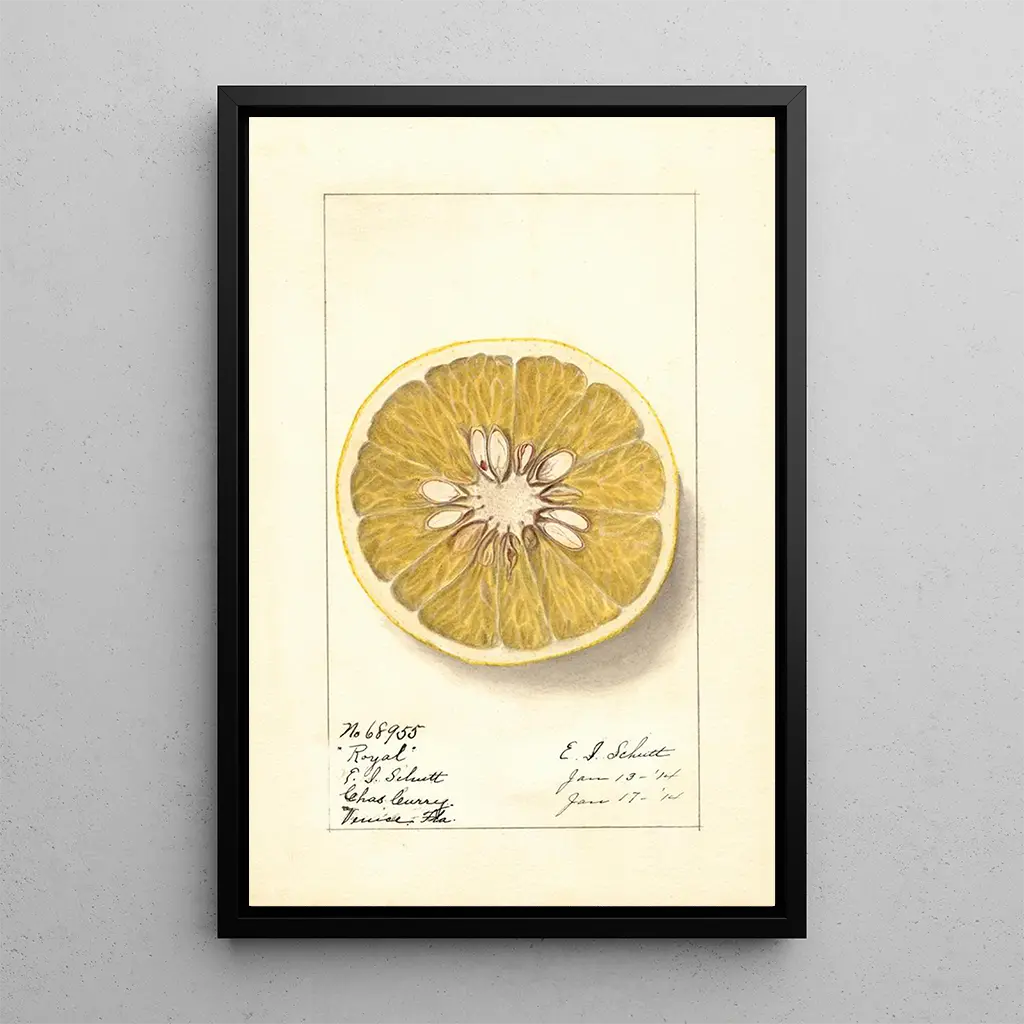 Konsttrycket Citrus paradisi Royal av Ellen Isham Schutt visar en magnifik tolkning av den kungliga grapefrukten, där livfulla färger och noggranna detaljer vävs samman för att skapa en fängslande scen. Skiftningarna mellan grönt och guld, kombinerat med den rika texturen av frukten, framkallar en känsla av lyx och överflöd. Akvarelltekniken, med sina transparenser och delikata överlagringar, gör det möjligt att känna fruktens fräschör och saftighet, vilket förvandlar detta konsttryck till en sann hyllning till naturen.