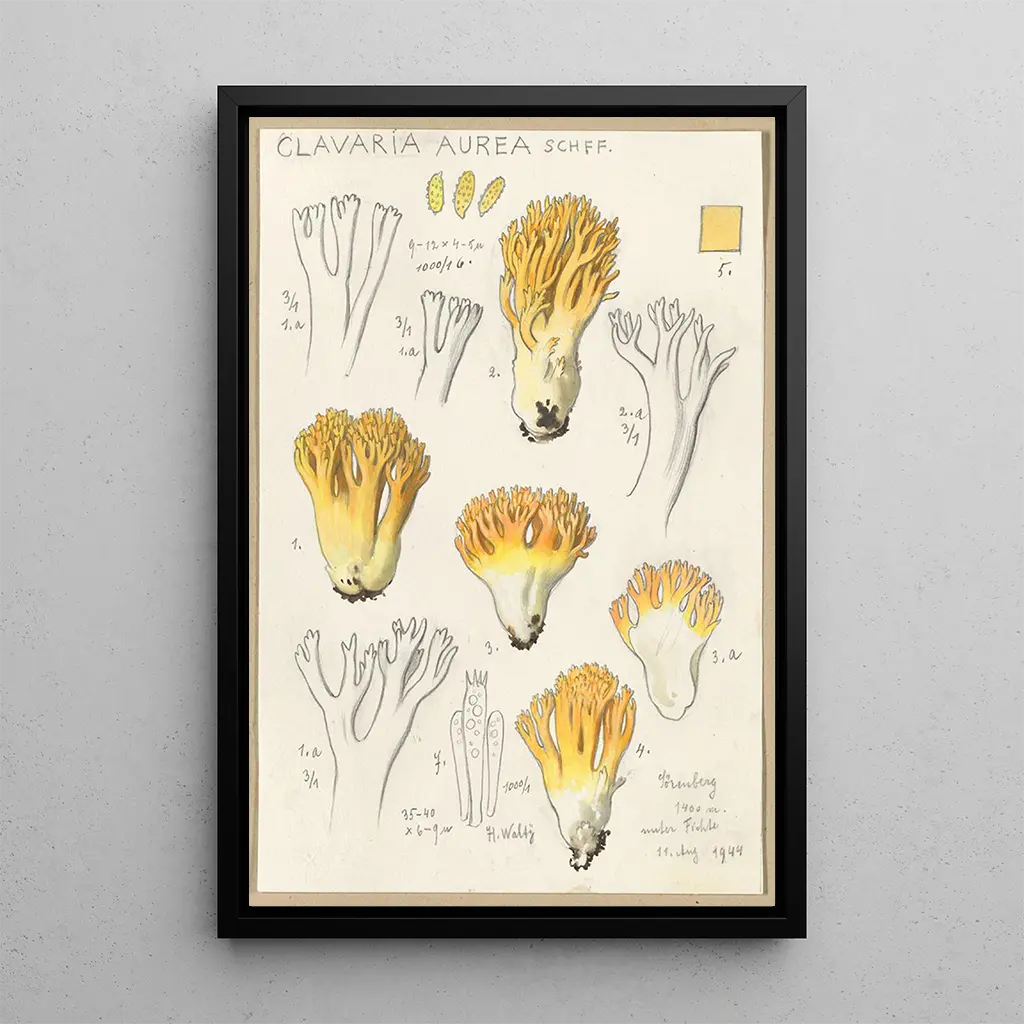Clavaria aurea Schff, ett konsttryck av Hans Baldung, förflyttar oss till en värld där svampars elegans lyfts fram. De gyllene nyanserna och de slanka formerna i detta konsttryck förmedlar en naturlig elegans, nästan eterisk. Baldungs teknik, präglad av precisa drag och noggrann uppmärksamhet på detaljer, skapar en atmosfär som är både lugn och fängslande. Varje svamp tycks vibrera av liv, inbjudande betraktaren att beundra naturens flyktiga skönhet.