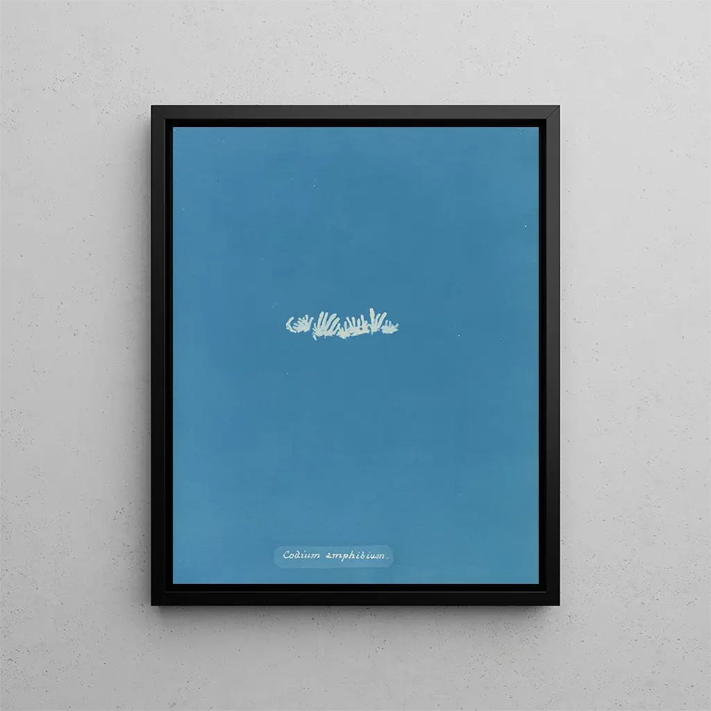 Konsttryck Codium amphibium - Anna Atkins – Fängslande introduktion Fotografi och konst möts på ett slående sätt i Anna Atkins ikoniska verk, "Codium amphibium". Denna pjäs, skapad under 1800-talet, är resultatet av en passion för botanik och en innovativ utforskning av fotografiska tekniker. Atkins, en pionjär inom användningen av cyanotypi, lyckades fånga skönheten hos marina alger med en finhet och precision som överskrider enbart visuell dokumentation. Genom att fördjupa sig i den vattenbaserade världen bjuder konstnären in oss att betrakta livets skörhet och komplexitet, samtidigt som hon ger oss ett fönster till vetenskap och estetik. Konsttryck Codium amphibium - Anna Atkins, är mycket mer än en enkel avbildning, det är en inbjudan att återupptäcka den naturliga världen genom ett konstnärligt prisma. Stil och unikhet i verket Cyanotypi, en fotografisk teknik som uppfanns i början av 1800-talet, står i centrum för Atkins verk. Hennes unika tillvägagångssätt gör det möjligt att skapa utskrifter med en anmärkningsvärt klarhet och djup. I "Codium amphibium" harmoniserar nyanser av blått, typiska för denna metod, med den finstämda formen av organiska strukturer för att ge liv åt en komposition som är både vetenskaplig och poetisk. Varje alg, varje detalj, framhävs genom subtila kontraster, vilket avslöjar texturen och strukturen hos de fotograferade objekten. Detta val av motiv är långt ifrån oavsiktligt, och vittnar om en djup respekt för naturen och en vilja att hylla den genom konst. Verkets unika karaktär ligger i dess förmåga att förena vetenskaplig noggrannhet med konstnärlig känsla, vilket skapar en immersiv visuell upplevelse. Konstnären och hennes inflytande Anna Atkins, ofta betraktad som den första kvinnliga fotografen, banade väg för många generationer av konstnärer och forskare. Hennes engagemang för botanik och hennes önskan att dokumentera marina växter berikade inte bara fotografiområdet utan bidrog också till att främja vetenskapen under sin tid. Atkins samarbetade med botaniker och naturalister, och strävade efter att skapa en dialog mellan konst och vetenskap. Hennes inflytande består än idag, och inspirerar samtida konstnärer som utforskar förhållandet mellan natur och teknologi. Genom att integrera