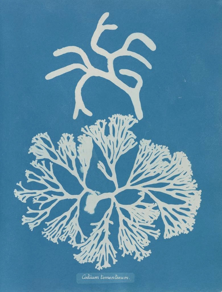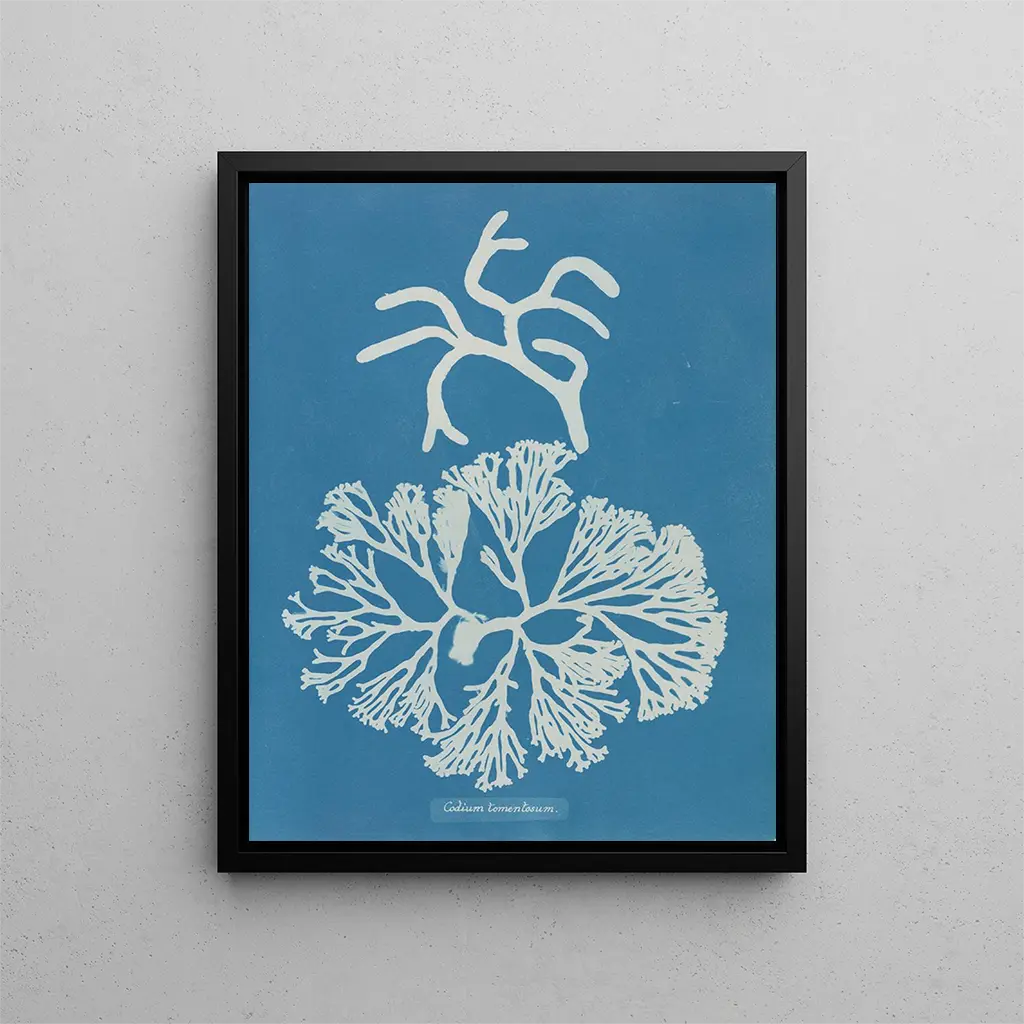 Konsttryck Codium tomentosum - Anna Atkins – Fängslande introduktion Inom den fascinerande världen av konsthistoria utmärker sig vissa verk genom sin förmåga att förena vetenskap och estetik. "Codium tomentosum - Anna Atkins" är ett utmärkt exempel. Detta verk, som överskrider enkla konstnärliga klassifikationer, för oss in i en värld där botanik möter fotografi och avslöjar skönheten i naturliga former ur ett nytt perspektiv. Anna Atkins, pionjär inom botanisk fotografi, lyckades fånga den ömtåliga och komplexa världen av växter, hyllande naturen samtidigt som hon utforskade gränserna för konst och vetenskap. Stil och unikhet i verket Anna Atkins' stil kännetecknas av en noggrann metod och en skarp observationsförmåga. "Codium tomentosum" illustrerar perfekt hennes engagemang för en trogen återgivning av naturen. Genom cyanotyper, en fotografisk teknik som hon bidrog till att popularisera, lyckas Atkins bevara de mest subtila detaljerna i algerna. Nyansen av blått, typisk för denna metod, ger verket en dimension som är både eterisk och påtaglig. Varje tryck är unikt och vittnar om varje specimens singularitet. Kompositionen av "Codium tomentosum" är både enkel och komplex, med lekfulla organiska former och negativa utrymmen, vilket inbjuder betraktaren till djup reflektion. Detta konstverk nöjer sig inte med att avbilda ett element av den marina floran; det väcker också en tanke kring vår ekosystems sårbarhet och den inneboende skönheten i naturen. Konstnären och hennes inflytande Anna Atkins, ofta betraktad som den första kvinnliga fotografen, banade väg för många konstnärliga och vetenskapliga utforskningar. Genom att kombinera sin kärlek till botanik med de teknologiska innovationer som fanns på hennes tid, dokumenterade hon inte bara växtarter utan omdefinierade också konstnärens roll i samhället. Hennes verk hade en betydande inverkan på utvecklingen av fotografi som konstnärligt medium och inspirerade generationer av konstnärer att utforska gränserna mellan konst och vetenskap. Atkins lyckades skapa en dialog mellan dessa två områden och visade att noggrann observation av naturen kunde leda till skapelser av stor skönhet. Hennes arv lever vidare i den samtida världen, där konstnärer fortsätter