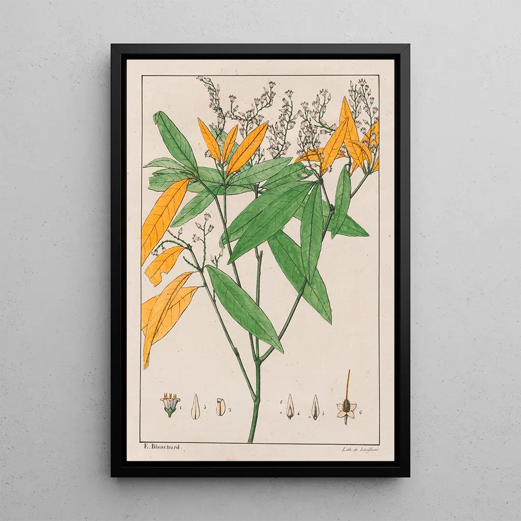 Den konsttryck av Conohoria Lobolobo för oss till hjärtat av frodiga skogar, där denna sällsynta växt utmärker sig genom sina former och sina livfulla färger. De glänsande nyanserna av grönt och lila blandas i en visuell dans, som framkallar rikedomarna i biologisk mångfald. Tekniken för Auguste de Saint-Hilaires illustration lyfter fram varje detalj, från bladnervarnas strukturer till de delikata nyanserna av blommorna. Detta verk är mycket mer än en enkel botanisk representation; det är en inbjudan att utforska naturens skönhet och komplexitet.