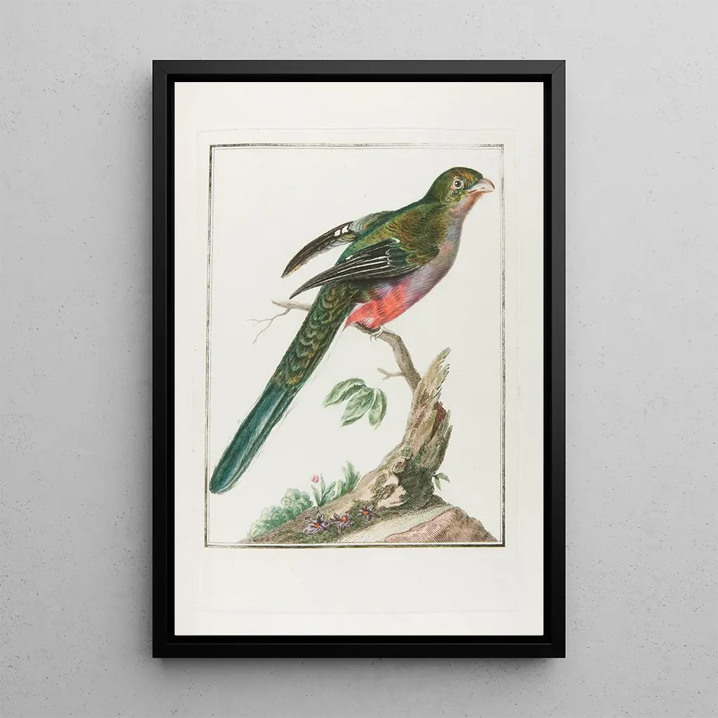 "Couroucou d'Afrique hona" är ett konsttryck som fångar skönheten och elegansen hos denna ikoniska fågel. François Levaillant, som både är ornitolog och konstnär, lyckas med precision att föreviga de delikata detaljerna hos denna fågel, från fjädrarna till de subtila nyanserna i dess fjäderdräkt. Kompositionen framhäver den eleganta hållningen hos couroucou, vilket skapar en atmosfär av lugn och mystik. De jordnära färgerna och gröna inslagen påminner om fågelns naturliga miljö, och skapar en djup koppling mellan konst och natur. Detta konsttryck inbjuder till flykt, till upptäckten av en vild och fascinerande värld.