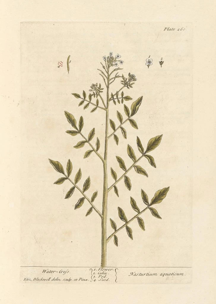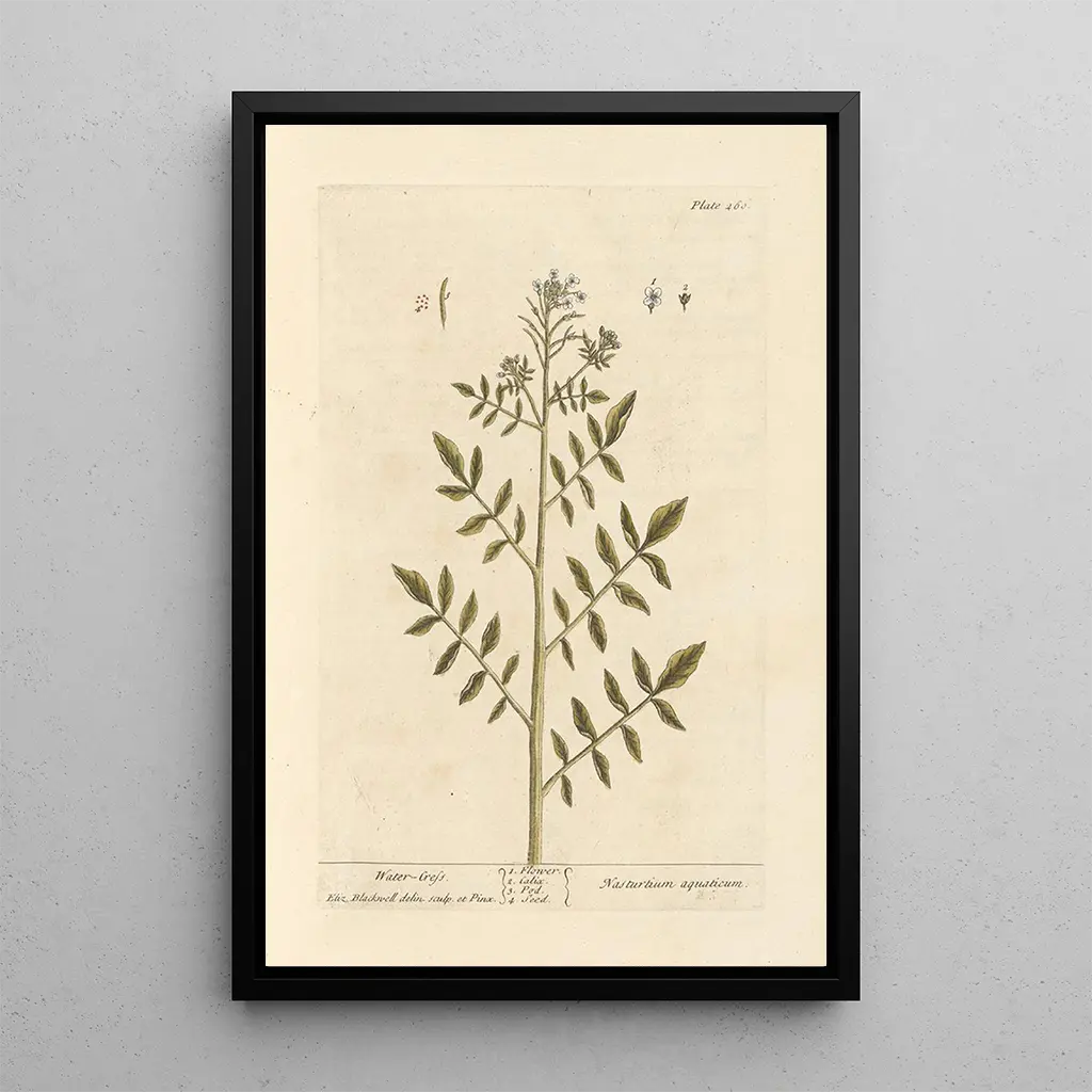 I detta konsttryck av Cresson tar Elizabeth Blackwell oss till hjärtat av en livfull och delikat natur. Canvastavlan utmärker sig med sina nyanser av grönt, som framkallar friskheten hos floder och trädgårdar. De noggranna detaljerna i blad och blommor vittnar om en noggrann observation och en förfinad graveringsteknik. Atmosfären som utstrålar från detta verk är lugnande, inbjudande betraktaren att uppskatta den enkla men väsentliga skönheten hos denna vattenväxt. Varje element är omsorgsfullt arrangerat, vilket skapar en harmonisk komposition som hyllar den rika växtligheten.