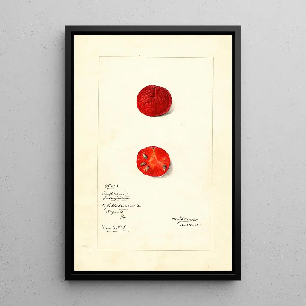 Den konsttryck av Cudrania tricuspidata av Mary Daisy Arnold fördjupar oss i en frodig värld där skönheten hos exotiska frukter framhävs. De rika och varierade nyanserna i detta konsttryck återspeglar värmen från tropiska regioner, medan den harmoniska kompositionen drar blickarna mot de delikata detaljerna i varje frukt. Akvarelltekniken, med sina subtila övergångar, skapar en livfull och dynamisk atmosfär som hyllar naturens prakt. Detta konsttryck inbjuder till en sensorisk upptäcktsresa, där man nästan kan känna sötman och doften av frukterna.