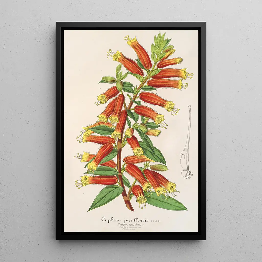 Detta konsttryck av Cypha Cuphea jorullensis är ett perfekt dekorativt val för att tillföra en touch av exotism till ditt hem. Oavsett om det är i ett vardagsrum, ett kontor eller ett sovrum, kommer det att fängsla blicken och liva upp atmosfären. Kvaliteten på trycket och färgernas trohet gör detta konsttryck till en verklig estetisk tillgång. Genom att integrera detta verk i din inredning väljer du att tillföra en känsla av friskhet och dynamik, samtidigt som du hyllar naturens skönhet genom konst.
