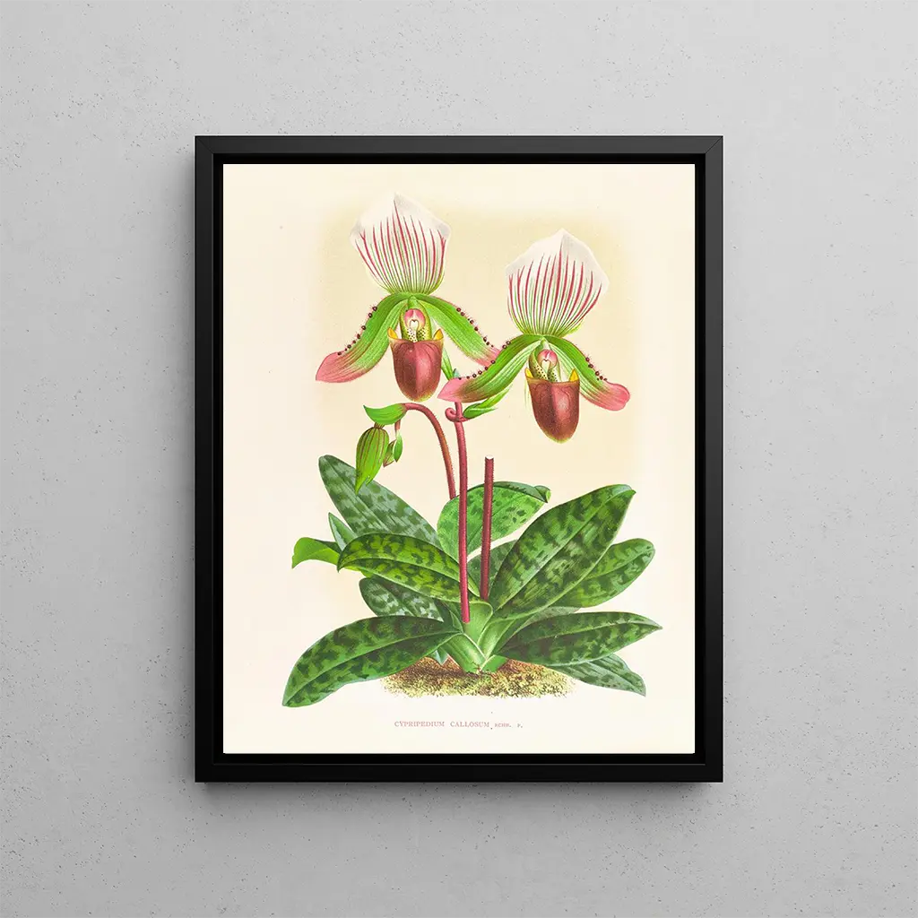 Upptäck den eleganta Cypripedium callosum, en förtrollande orkidéart som hyllas för sina unika blommor och sin eleganta form. Perfekt för samlare och älskare av exotiska växter, denna reproduktion av konstnärliga botaniska illustrationer ger ett sofistikerat tillskott till ditt hem eller kontor.