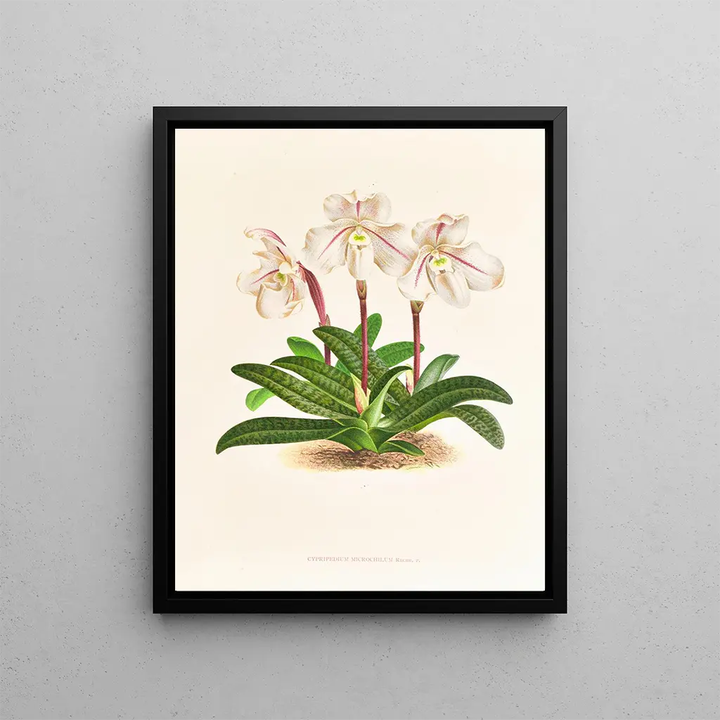 Upptäck den vackra reproduktionen av Cypripedium microchilum av Jean Jules Linden, perfekt för att förhöja din inredning. Denna konstnärliga affisch fångar den unika skönheten hos denna sällsynta orkidé, noggrant reproducerad för att behålla varje detalj och färgnyans.