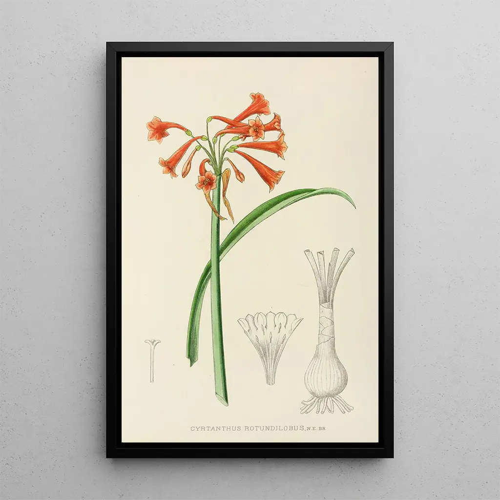 Konsttrycket av Cyrtanthus rotundilobus är ett perfekt val för att försköna ditt hem, oavsett om det är i ett vardagsrum, ett kontor eller ett sovrum. Dess tryckkvalitet garanterar en trohet mot färger och detaljer i det ursprungliga verket, samtidigt som det tillför en touch av elegans och friskhet till din inredning. Den estetiska dragningskraften hos denna duk gör den till ett centralt element i ditt utrymme, som väcker beundran och nyfikenhet hos dina gäster. Unna dig detta unika konsttryck som förenar konst och natur, och låt dig föras bort av den tidlösa skönheten hos denna ikoniska blomma.