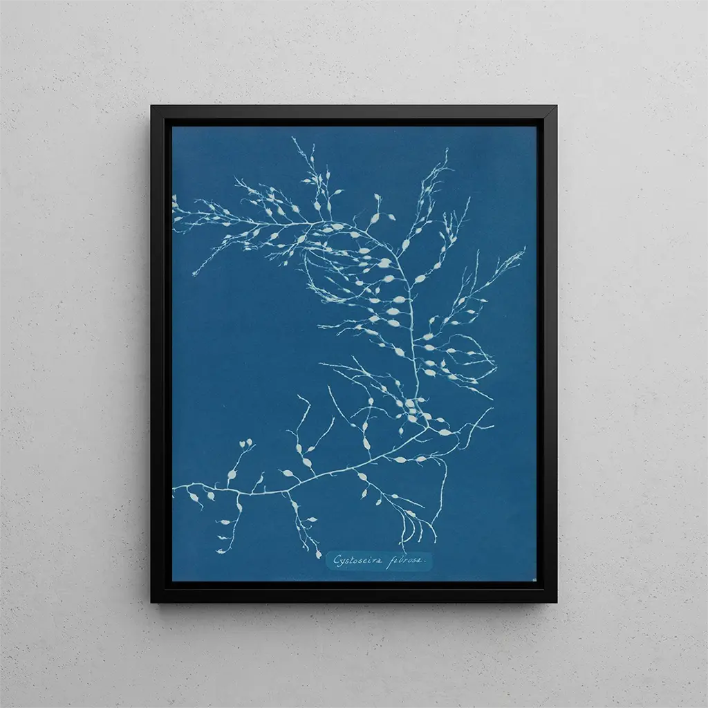 Anna Atkins stil utmärker sig genom sin innovativa ansats till fotografi, där hon använde cyanotypetekniken för att skapa djupa och livfulla blåa tryck. I konsttrycket Cystoseira fibrosa är varje algdetalj noggrant återgiven, vilket avslöjar texturer, former och nyanser av färg som fängslar blicken. Verket nöjer sig inte med att avbilda objektet; det höjer det till konstnivå och erbjuder en poetisk syn på botanik. De delikata skuggorna och de skarpa konturerna av algerna skapar en slående kontrast, medan den ljusa bakgrunden framhäver naturens organiska skönhet. Denna bit är en hyllning till livets skörhet och rikedom, samtidigt som den firar den konstnärliga potentialen i vetenskapen.