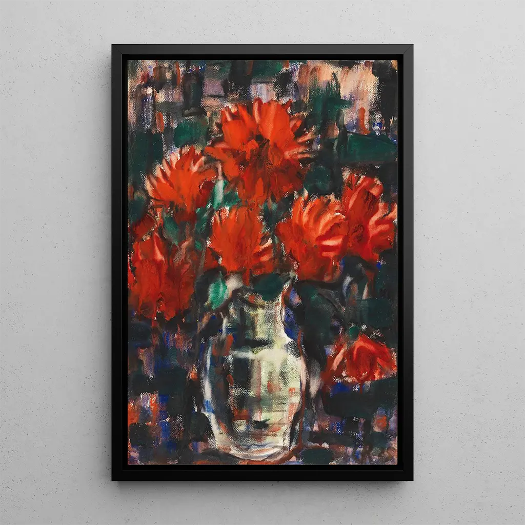 Dahlias, i detta verk av Christian Rohlfs, utspelar sig i en symfoni av strålande färger. Blommornas kronblad, i varierande nyanser av rött, orange och gult, tycks dansa under ljuset och skapar en glad och livfull atmosfär. Rohlfs teknik, kännetecknad av djärva och uttrycksfulla penseldrag, ger liv åt varje blomma och gör dem nästan påtagliga. Bakgrunden, subtilt suddig, framhäver dahliornas skönhet och bjuder in betraktaren att fördjupa sig i denna frodiga trädgård. Detta konsttryck av målningen "Dahlias" är en sann hyllning till naturen och fångar essensen av dessa majestätiska blommor.