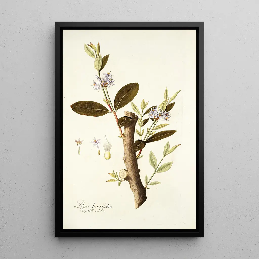 Dais laurifolia, illustrerad av Nikolaus Joseph Freiherr von Jacquin, är ett konsttryck som hyllar naturens rikedom. Detta konsttryck framhäver nyanser av djupt grönt och inslag av glänsande vitt, vilket framkallar friskheten hos bladen och finheten hos blommorna. Den akvarellteknik som Jacquin använder ger en känsla av lätthet och transparens i de naturliga elementen, vilket skapar en lugn och kontemplativ atmosfär. Varje detalj är noggrant observerad, inbjudande till en visuell utforskning av former och texturer hos denna fascinerande växt.