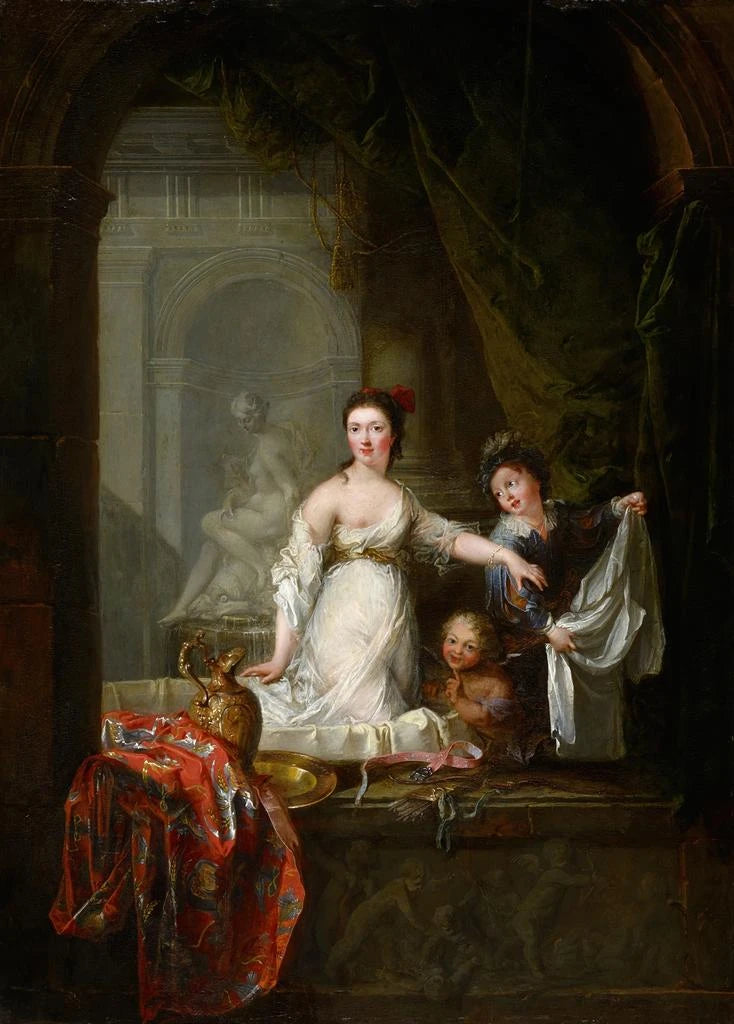 Konsttrycket "Dame i badet med cupido" av Robert Tournières framkallar en atmosfär av mildhet och sensualitet. Detta verk föreställer en elegant kvinna, nedsänkt i ett bad, omgiven av charmiga cupido som verkar leka runt henne. Pastellfärger och ljusspel skapar en lugn och intim stämning, medan de raffinerade detaljerna i draperingar och dekorativa element tillför en touch av sofistikering. Kompositionen, som är både dynamisk och harmonisk, inbjuder betraktaren att fördjupa sig i detta ögonblick av skönhet och lugn, där tiden tycks stå stilla.