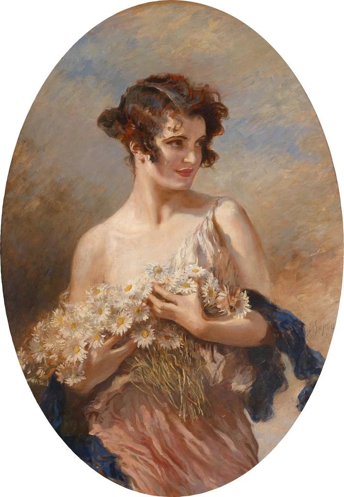 I denna konsttryck av verket "Dame med en bukett av prästkragar" fångar Leopold Schmutzler med ömhet en kvinnas grace som håller en blomsterbukett. De mjuka pastellfärgerna, blandade med ljusinslag, skapar en romantisk och drömmande atmosfär. Kompositionen framhäver damens lugna ansikte, medan prästkragarna, symboler för oskuld och renhet, tillför en poetisk dimension till helheten. Användningen av ljus och skuggor vittnar om en teknisk skicklighet som inbjuder till eftertanke och uppskattning av den naturliga skönheten.
