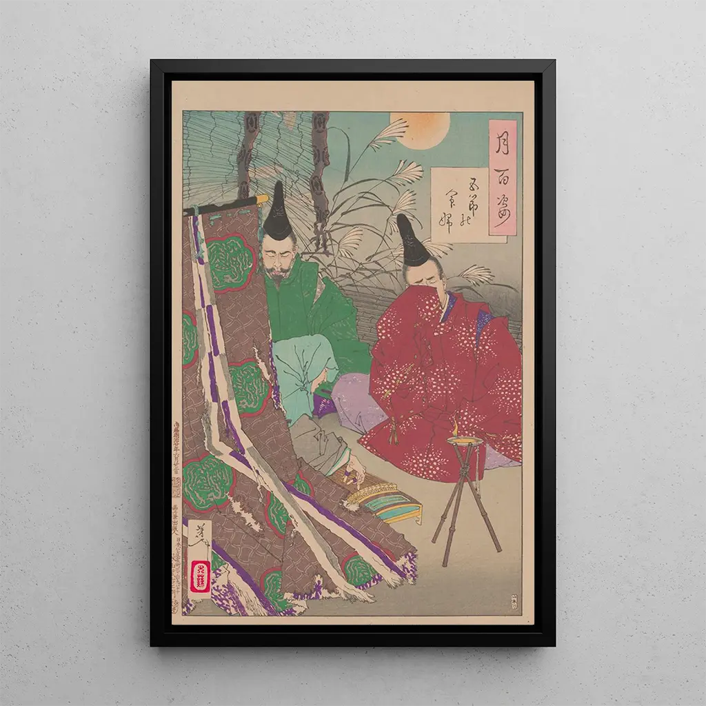 Dame Gosechi : en konsttryck av en japansk själ dans dans I detta konsttryck av Dame Gosechi fångar Tsukioka Yoshitoshi elegansen och grace hos en traditionell japansk dansare. De livfulla färgerna och de delikata mönstren på hennes kimono framkallar en atmosfär av lugn och tidlös skönhet. Kompositionen, med sina flytande linjer och noggranna detaljer, inbjuder betraktaren att fördjupa sig i den raffinerade världen av japansk kultur. Det mjuka ljuset som lyser upp dansarens ansikte tillför en nästan andlig dimension till verket, och understryker hennes roll som mellanhand mellan den materiella världen och andevärlden. Tsukioka Yoshitoshi : mästare av ukiyo-e-tryck Tsukioka Yoshitoshi, en av de sista stora mästarna inom ukiyo-e, lyckades förena tradition och modernitet i sina verk. Aktiv under andra hälften av 1800-talet, påverkades han av de sociala och politiska omvälvningarna i Japan, samtidigt som han hämtade inspiration från de klassiska teman av kvinnlig skönhet och historiska berättelser. Yoshitoshi omdefinierade det japanska konsttrycket, genom att integrera berättande element och djupa känslor, vilket gjorde att han utmärkte sig från sina föregångare. Hans förmåga att fånga essensen av sina motiv, som i Dame Gosechi, vittnar om hans betydelse i japansk konsthistoria. En dekorativ konsttryck med många fördelar Dame Gosechi-konsttrycket är ett dekorativt föremål som kommer att berika vilket utrymme som helst, vare sig det är ett vardagsrum, ett kontor eller ett sovrum. Dess tryckkvalitet och trohet mot de ursprungliga detaljerna gör det till ett perfekt val för konst- och kulturentusiaster. Med sin obestridliga estetiska attraktion kommer detta konsttryck att tillföra en touch av elegans och lugn till ditt hem. Genom att välja detta konsttryck inbjuder du inte bara ett konstverk i ditt hem, utan också en bit av japansk historia och tradition.