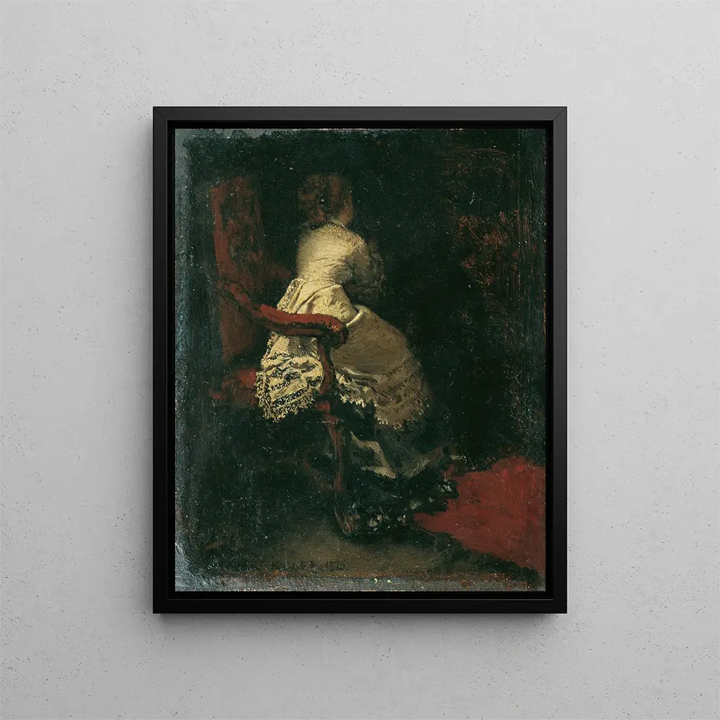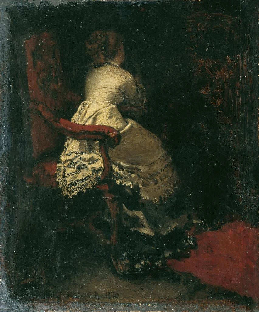 Le style d'Albert von Keller se distingue par une approche réaliste et une sensibilité particulière aux émotions humaines. Dans Dame dans un fauteuil, le choix des couleurs chaudes et des ombres délicates confère à l'œuvre une atmosphère presque palpable. La posture de la femme, à la fois détendue et pensive, révèle une introspection profonde, tandis que le fauteuil, richement orné, évoque le confort et l'élégance. Keller excelle dans le rendu des textures, que ce soit à travers le tissu du vêtement ou la douceur des cheveux, créant ainsi une harmonie visuelle qui captive l'œil. La lumière, subtilement modulée, joue un rôle essentiel, illuminant le visage de la dame et accentuant l'intensité de son regard, invitant ainsi le spectateur à s'interroger sur ses pensées.