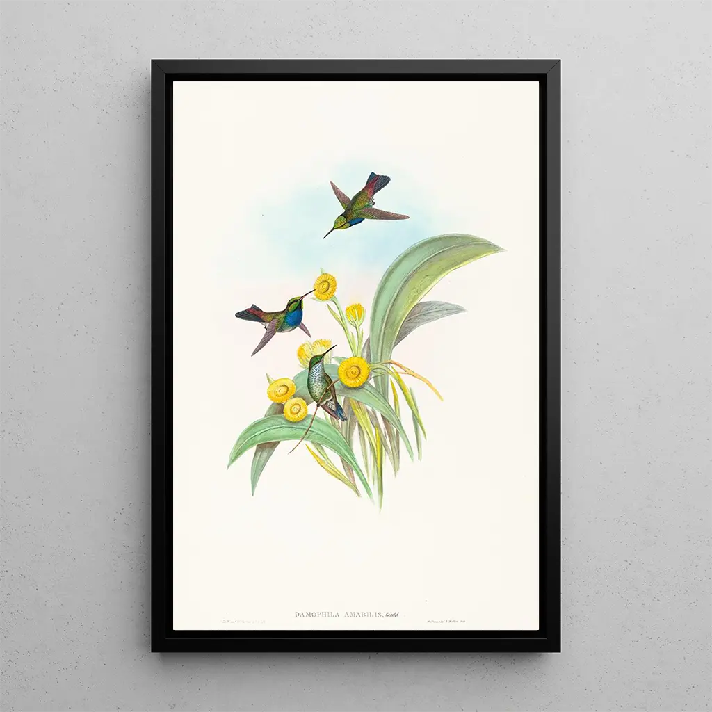 John Gould, brittisk naturalist och ornitolog från 1800-talet, är erkänd för sina enastående bidrag till ornitologisk illustration. Hans passion för fåglar ledde honom att resa världen runt och fånga den fågelrika mångfalden med ett unikt konstnärligt öga. Påverkad av de vetenskapliga upptäckterna i sin tid, lyckades Gould kombinera vetenskaplig noggrannhet med konstnärlig känslighet, vilket gör hans verk till oumbärliga referenser. Hans serie av illustrationer, inklusive konsttrycket av Damophila amabilis, har inte bara berikat ornitologins område utan också satt avtryck i konsthistorien med sin förmåga att fånga naturens skönhet.