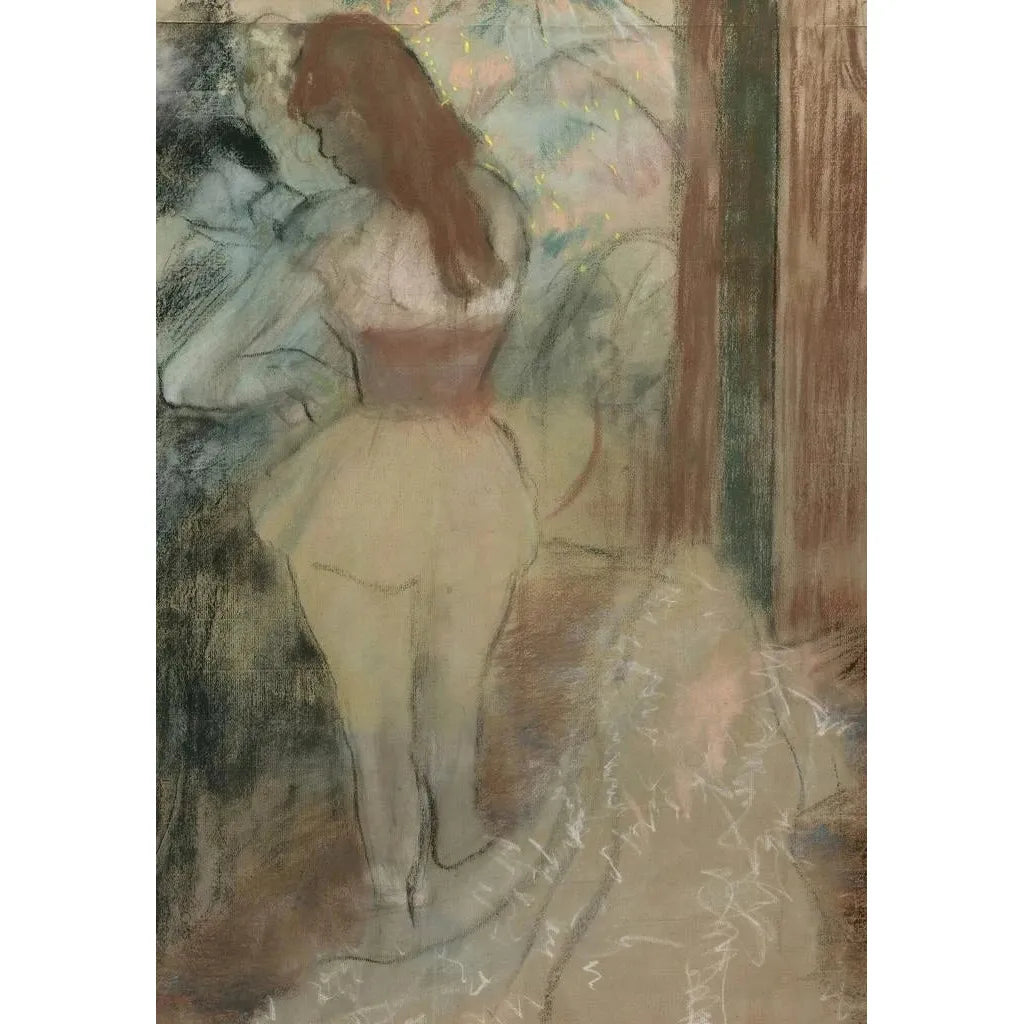 I "Danseerska som klär på sig" fördjupar sig Edgar Degas i intimiteten av ett förberedelseögonblick före scenframträdandet. Detta konsttryck, rikt på detaljer, avslöjar skönheten i rörelse och ömheten i kvinnliga gester. De varma färgerna och ljusspel betonar scenens mildhet, medan pastelltekniken ger en nästan taktil textur till duken. Dansösen, fokuserad och elegant, förkroppsligar passionen och engagemanget hos balettdansare. Varje penseldrag tycks andas liv, och förvandlar ett enkelt scenförberedelseögonblick till ett verkligt konstverk.