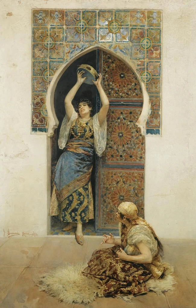 I "La Danse" fångar Gustavo Simoni själva essensen av glädje och mänsklig energi genom en livfull och dynamisk komposition. De strålande färgerna, som sträcker sig från djupa röda till ljusa gula, skapar en festlig atmosfär som inbjuder betraktaren att låta sig svepas med av dansens rytm. Simonis teknik, som blandar impressionism och realism, ger liv åt figurerna som nästan tycks komma ut ur duken. Varje rörelse är frusen i tiden, men verket andas en sådan vitalitet att man nästan kan höra musiken som följer denna glädjefyllda dans.