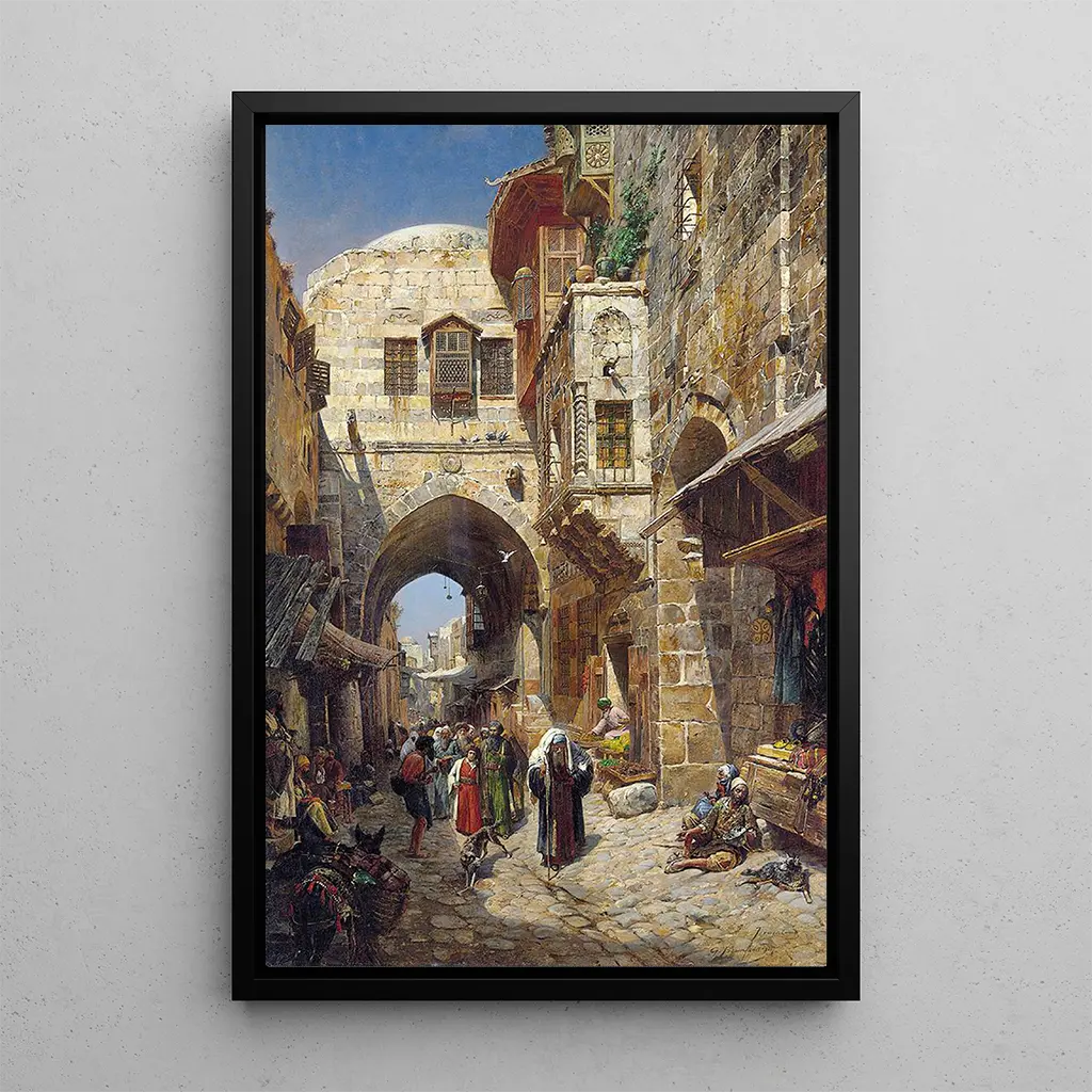 Gustav Bauernfeind, tysk målare född 1848, är erkänd för sina verk som fångar essensen av landskap och vardagsscener i Orienten. Påverkad av impressionismens rörelse, utvecklade han en unik stil som förenar precision och känsla. Hans karriär ägde rum huvudsakligen i slutet av 1800-talet, en period präglad av ett växande intresse för orientaliska kulturer i Europa. Bauernfeinds resor till Heliga landet påverkade hans konst djupt, vilket gav honom möjlighet att fånga ljuset och färgerna i en värld som var både främmande och bekant. Hans verk, inklusive Rue David, vittnar om denna fascination för Orienten.
