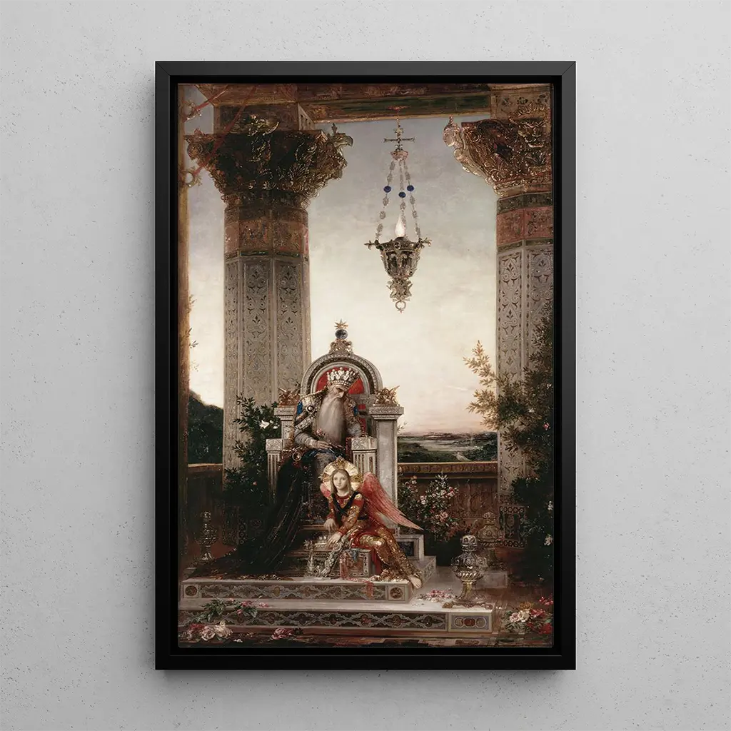 Dans "Le roi David", Gustave Moreau capture la grandeur et la complexité d'un personnage biblique emblématique. La composition est riche en symbolisme, avec des couleurs profondes et des détails minutieux qui soulignent la noblesse du roi. Moreau utilise une technique raffinée, mêlant des éléments réalistes à des touches d'imaginaire, créant ainsi une atmosphère à la fois solennelle et mystique. Le regard pénétrant de David, entouré de motifs floraux et de drapés somptueux, évoque une puissance tranquille, invitant le spectateur à s'interroger sur la nature du pouvoir et de la foi.