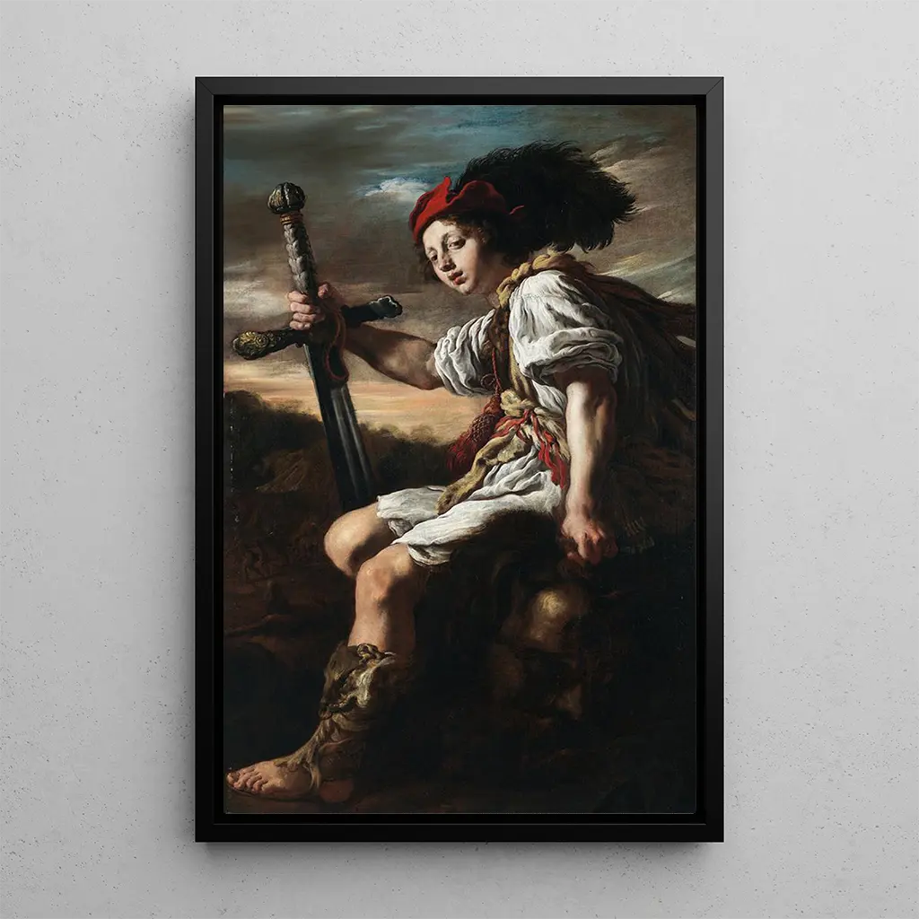 I detta slående konsttryck fångar Domenico Fetti det avgörande ögonblicket i kampen mellan David och Goliat. Den dynamiska kompositionen, med triumferande David, förstärks av livfulla färger och slående kontraster. De minutiösa detaljerna i Goliats halshuggna huvud, samt uttrycket av stolthet i Davids ansikte, skapar en atmosfär som är både dramatisk och heroisk. Fettis teknik, som blandar chiaroscuro och realism, ger liv åt denna bibliska scen och inbjuder betraktaren att känna intensiteten i detta historiska ögonblick.