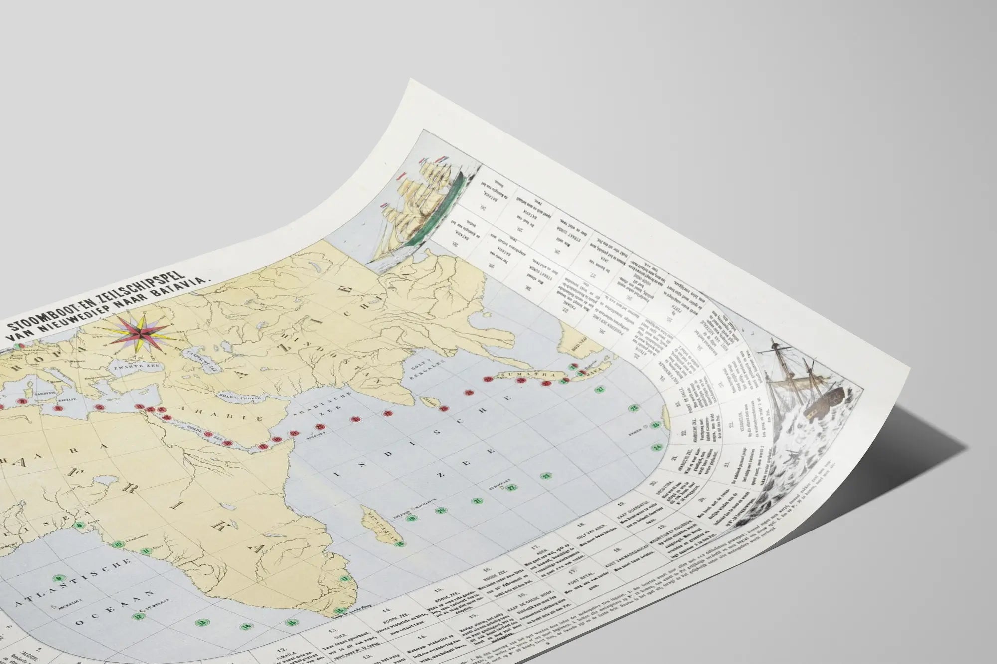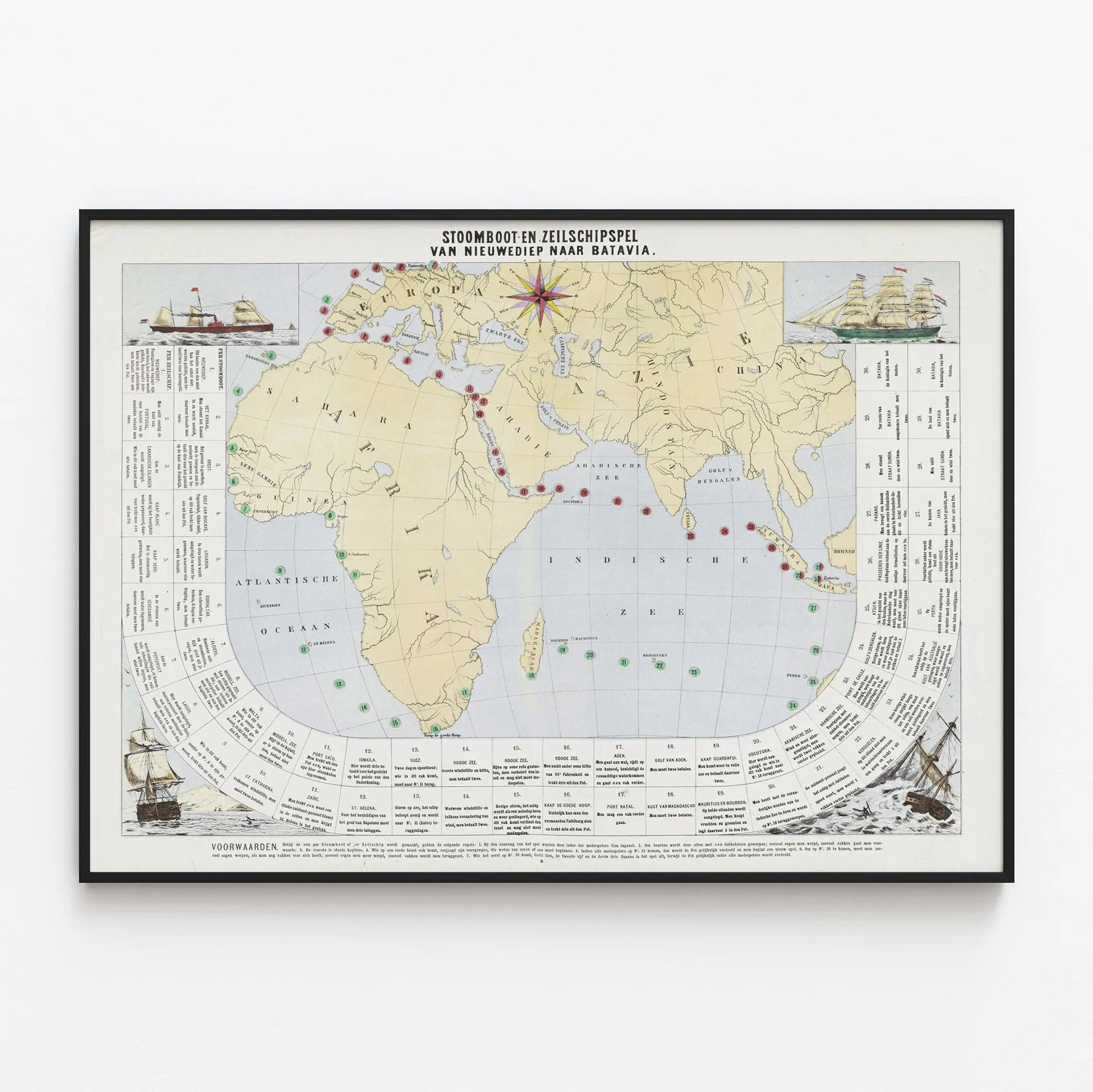 Denna vintage kartaffisch illustrerar den historiska sjövägen mellan Nieuwediep och Batavia, och skildrar en duell mellan en ångbåt och en klassisk segelbåt. Denna väggdekoration visar en detaljerad sjökarta över Atlanten, den afrikanska kusten och Indiska oceanen, som leder till ön Java i Sydostasien. Perfekt för entusiasten av navigation, maritim historia eller äventyr, tillför detta väggtavla en touch av elegans och äkthet till vilket utrymme som helst. Kartan innehåller noggranna anteckningar om de olika stoppställen, numrerade och med beskrivningar på nederländska, som dokumenterar de viktigaste etapperna av resan. Designen inkluderar noggranna illustrationer av de två typerna av fartyg: en ångbåt i övre vänstra hörnet och en tremastad segelbåt i övre högra hörnet, vilket ger en estetisk och informativ dimension till denna väggdekoration. De mjuka färgerna och de vintage-reflexerna ger detta poster ett gammaldags utseende som harmoniskt kompletterar både klassiska och moderna interiörer. Använd som dekorativ tavla, inbjuder detta sjökort till upptäcktsfärd och drömmande tankar om forna resor, och väcker äventyr på vågorna samt charmen med segling och ångfart. Den är idealisk för vardagsrum, kontor eller tematiska utrymmen kring havet, resor och upptäcktsfärder. Sammanfattningsvis är denna kartväggdekoration ett perfekt val för att berika ditt hem med en unik affisch som kombinerar historia, konst och maritim kultur.