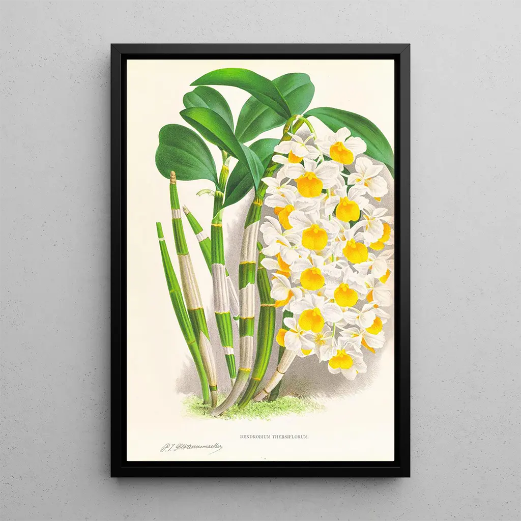 Konsttrycket av tavlan Dendrobium thyrsiflorum är ett perfekt dekorativt föremål för att försköna ditt hem. Oavsett om det är i ett vardagsrum, ett kontor eller ett sovrum, tillför denna duk en känsla av friskhet och färg. Dess utskriftskvalitet garanterar trohet mot detaljerna i originalverket, vilket gör att du kan njuta fullt ut av dess estetiska charm. Genom att välja detta konsttryck, väljer du en dekoration som framkallar naturens skönhet samtidigt som den tillför en touch av elegans till ditt levnadsutrymme.
