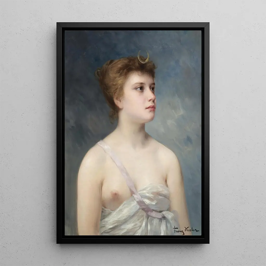 I detta fängslande verk skildrar Franz Xaver Kosler Diane, jaktens gudinna, med en anmärkningsvärt grace och elegans. Kompositionen präglas av mjuka färger och nyanser av grönt och blått, som framkallar den omgivande naturen. Konstnärens teknik, som skickligt blandar realism och romantik, skapar en lugn och kontemplativ atmosfär. De noggranna detaljerna i ansiktet och draperierna framhäver Dianas tidlösa skönhet, medan ljuset leker över hennes hud och förstärker hennes gudomliga aura. Detta konsttryck av Diane är en verklig inbjudan till kontemplation och beundran.