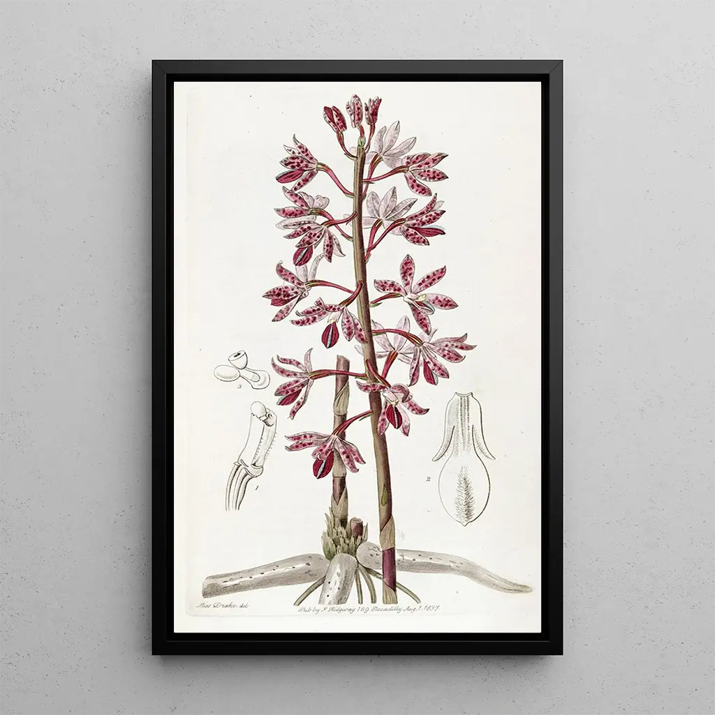 Dipodium tacheté : en exotisk skönhet att upptäcka Konsttrycket 'Dipodium tacheté' av Sydenham Edwards för oss in i en livfull blomstervärld. De strålande färgerna, från lila till vitt, blandas harmoniskt och skapar en atmosfär som är både delikat och förtrollande. Tekniken med akvarell, använd med fin precision, gör det möjligt att återge genomskinligheten hos blombladen och rikedomarna i detaljerna. Varje blomma tycks komma till liv och bjuder in betraktaren att närma sig för att beundra varje penseldrag. Detta verk, både vetenskapligt och konstnärligt, för oss till en frodig trädgård där naturen uttrycker sig i all sin prakt. Sydenham Edwards : en pionjär inom botanisk illustration Sydenham Edwards, verksam i början av 1800-talet, är erkänd för sin viktiga roll inom botanisk illustration. Påverkad av den romantiska rörelsen, lyckades han förena vetenskaplig precision med konstnärlig känsla. Hans verk, inklusive 'Dipodium tacheté', vittnar om hans engagemang för att återge floran med en anmärkningsvärt trogen detaljrikedom. Edwards samarbetade med framstående botaniker och bidrog till spridningen av botanisk kunskap under sin tid. Hans stil, präglad av noggrann uppmärksamhet på detaljer, markerade en era då utforskningen av naturen var på sin höjd, vilket gör honom till en oumbärlig figur inom konstnärlig botanisk illustration. En dekorativ konsttryck med många fördelar Konsttrycket av 'Dipodium tacheté' är ett perfekt dekorativt inslag för att försköna ditt hem. Oavsett om det är i vardagsrummet, på kontoret eller i sovrummet, tillför detta konsttryck en touch av elegans och friskhet. Dess utskriftskvalitet garanterar en trogen återgivning av färger och detaljer i originalverket, så att du kan njuta fullt ut av dess skönhet. Den estetiska dragningskraften hos detta konsttryck ligger i dess förmåga att harmoniskt passa in i olika inredningsstilar, oavsett om de är moderna eller klassiska. Genom att välja detta konsttryck, väljer du ett verk som inte bara berikar ditt utrymme, utan också framkallar naturens prakt.