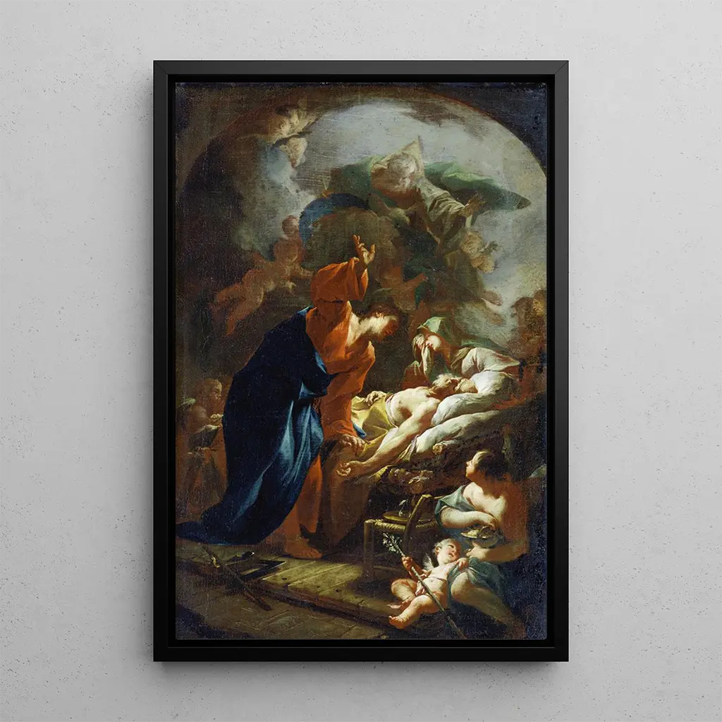 La Mort de Joseph, ett ikoniskt konsttryck av Paul Troger, framkallar en djup melankoli genom en palett av varma färger och noggranna detaljer. Kompositionen, centrerad kring Josephs kropp, omgiven av hans nära och kära, skapar en atmosfär av eftertanke och ömhet. Personernas ansikten, fyllda av en tydlig känsla, återges med enastående finhet, medan draperierna i kläderna tillför rörelse och liv. Ljuset, subtilt arrangerat, förstärker uttrycken och gesterna, och fördjupar betraktarens upplevelse av ett intimt och gripande ögonblick.