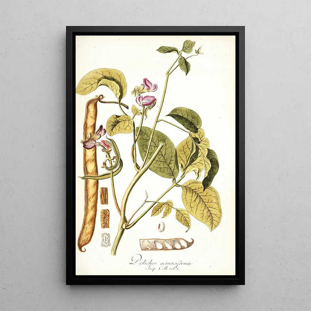 Dolichos acinaciformis : en utforskning av former och färger Konsttrycket av Dolichos acinaciformis, verk av Nikolaus Joseph Freiherr von Jacquin, utmärker sig genom sina organiska former och sina livfulla färger. De delikata blommorna och de rullade bladen är avbildade med en noggrannhet som understryker den inneboende skönheten hos denna växt. Färgpaletten, som växlar mellan lila, grönt och vitt, skapar en livfull och dynamisk atmosfär. Detta konsttryck inbjuder till en fördjupning i den växtliga världen, där varje detalj är en hyllning till naturens mångfald. Nikolaus Joseph Freiherr von Jacquin : en konstnär i skärningspunkten mellan konst och vetenskap Nikolaus Joseph Freiherr von Jacquin, en framstående figur från 1700-talet, präglade sin tid med sina bidrag till botanik och konst. Hans resor till Sydamerika berikade hans kunskaper och påverkade hans arbete, vilket placerade honom i framkant av botanisk illustration. Hans verk, som Dolichos acinaciformis, vittnar om hans noggrannhet och passion för naturen. Genom att kombinera vetenskaplig observation med konstnärlig känslighet har Jacquin lämnat ett outplånligt avtryck inom botanisk illustration. En dekorativ förvärv med många fördelar Konsttrycket av Dolichos acinaciformis är ett perfekt dekorativt val för att försköna alla typer av utrymmen, oavsett om det är ett vardagsrum, ett kontor eller ett sovrum. Dess tryckkvalitet och respekt för detaljer gör det till ett utmärkt val för konst- och botanikentusiaster. Detta konsttryck ger ett fräscht och färgstarkt tillskott till ditt hem, samtidigt som det stimulerar intresset för naturen. Med sin estetiska dragningskraft är detta konsttryck mycket mer än bara en dekoration – det är en inbjudan att uppskatta skönheten i den växtliga världen.
