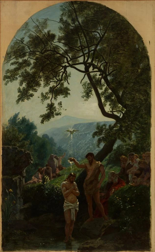 François-Louis Français, verksam under 1800-talet, är erkänd för sin romantiska och poetiska tolkning av målarkonsten. Påverkad av de stora mästarna från renässansen och barocken, har han lyckats integrera ljus- och färgelement som framkallar djupa känslor. Hans karriär, präglad av en strävan efter spiritualitet och skönhet, har närts av resor till Italien och möten med andra samtida konstnärer. "Le Baptême du Christ" ingår i en period då religiös konst upplever en renässans, vilket vittnar om trons betydelse i samhället under den tiden.
