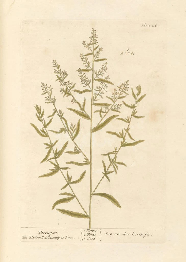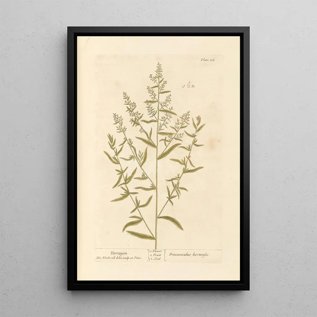 Konsttrycket Estragon av Elizabeth Blackwell är ett verk som hyllar skönheten hos medicinska växter. Med sina nyanser av grönt och inslag av gult lyfter denna illustration fram estragon, en aromatisk ört som är eftertraktad för sina kulinariska och medicinska egenskaper. Blackwell, genom sin karakteristiska stil, lyckas förmedla en livfull och dynamisk atmosfär, som fångar själva essensen av denna växt. De noggranna detaljerna och den harmoniska kompositionen inbjuder till noggrann eftertanke och avslöjar biodiversitetens rikedom.