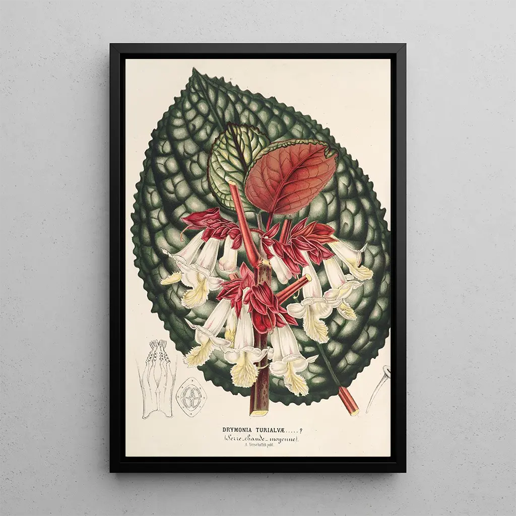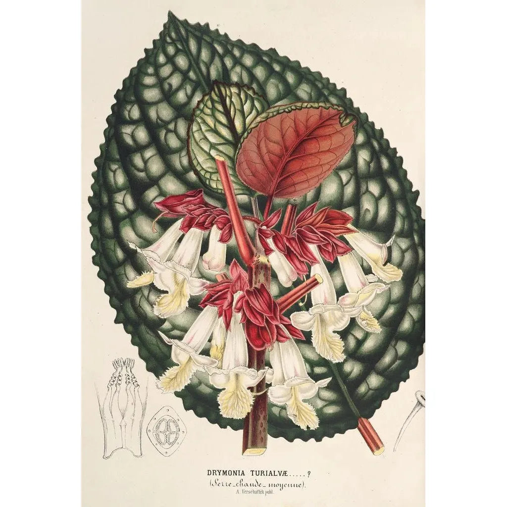 Konsttrycket av Drymonia Turialv, ett ikoniskt verk av Charles Antoine Lemaire, för oss in i en växtrik värld. De livfulla färgerna på denna målning framkallar rikedomarna i tropiska regnskogar, med glänsande gröna nyanser och inslag av rött och gult som lyser upp kompositionen. Lemaires teknik, som förenar botanisk precision med konstnärlig känslighet, skapar en atmosfär som är både realistisk och poetisk. Varje blad, varje blomma tycks vibrera under en lätt bris, vilket inbjuder betraktaren till en lugn reflektion över den naturliga skönheten.