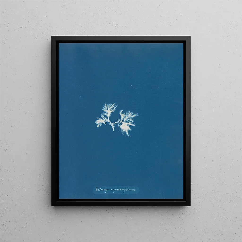 Konsttryck Ectocarpus sphaerophorus - Anna Atkins – Fängslande introduktion L'œuvre "Ectocarpus sphaerophorus" av Anna Atkins står som ett slående vittnesmål om mötet mellan konst och vetenskap under 1800-talet. Genom detta ikoniska konsttryck transcenderar Atkins, pionjär inom botanisk fotografi, gränserna för sin tid genom att fånga naturens delikata skönhet. Detta konsttryck, som hyllar hennes arbete, bjuder in betraktaren att fördjupa sig i en värld där estetik möter vetenskaplig observation. Cyanotypen, denna fotografiska teknik som hon behärskade mästerligt, avslöjar en djup och visuell rikedom som fängslar ögat och väcker sinnet. Stil och unikhet i verket Verket utmärker sig genom sin innovativa ansats till botanisk avbildning. Cyanotypen, med sina nyanser av djupt blått, erbjuder ett fascinerande kontrast till algers transparens, vilket skapar en visuell harmoni som drar till sig uppmärksamhet. Atkins nöjer sig inte med att reproducera former; hon förhöjer dem, förvandlar dem till verkliga konstverk. Varje detalj är noggrant framhävd, vilket avslöjar komplexiteten och den inneboende skönheten i naturen. Detta val av teknik och komposition ger "Ectocarpus sphaerophorus" en lätthet och flyt som nästan verkar eterisk. Sammanställningen av organiska motiv och vibrerande nyanser framkallar en dans mellan det levande och det inerta, och hyllar mångfalden i den naturliga världen. Konstnären och hennes inflytande Anna Atkins, ofta betraktad som den första kvinnliga fotografen, banade väg för en ny form av konstnärligt uttryck. Hennes engagemang för vetenskap och naturen har inte bara påverkat hennes samtida, utan fortsätter också att inspirera dagens konstnärer och forskare. Genom att integrera fotografi i botanisk studie dokumenterade hon inte bara floran i sin tid, utan etablerade också en ny standard för samspelet mellan konst och vetenskap. Hennes arbete bidrog till en bättre förståelse av alger och växter, samtidigt som det betonade behovet av en estetisk ansats i vetenskaplig utforskning. Atkins inflytande märks fortfarande i samtida praxis, där konst och vetenskap möts för att skapa.