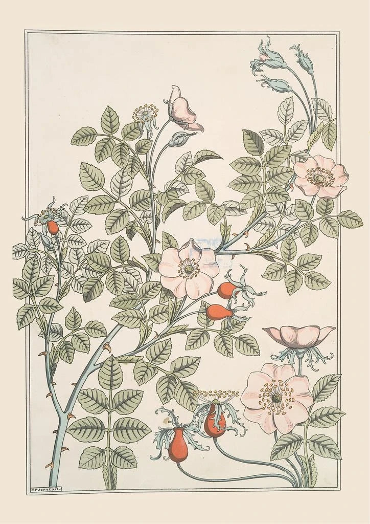 Maurice Pillard Verneuil, verksam i slutet av 1800-talet och början av 1900-talet, är erkänd som en mästare inom Art Nouveau. Påverkad av naturen och organiska former, lyckades han fånga essensen av sin tid genom sina verk. Verneuil samarbetade med hantverkare och formgivare, och integrerade sina blomstermotiv i olika områden, från målning till keramik. Hans stil kännetecknas av en förfinad elegans och ett noggrant fokus på detaljer, vilket gjorde att han utmärkte sig i den konstnärliga rörelsen under sin tid. "Églantier" vittnar om hans talang och förmåga att omvandla naturens skönhet till konst.