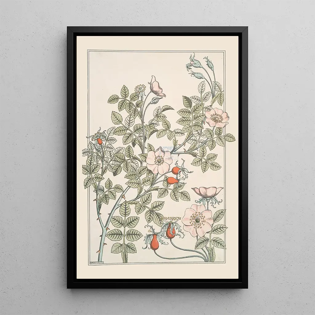 L'œuvre "Églantier" av Maurice Pillard Verneuil fördjupar oss i en blomstrande värld av färgstarka nyanser där livfulla toner blandas harmoniskt. De delikata blommande eklöven, med sina nyanser av rosa och grönt, känns nästan påtagliga, som om de var på väg att blomma ut framför våra ögon. Verneuils teknik, som kombinerar akvarell och teckning, skapar en lätt och luftig atmosfär som inbjuder till meditativ eftertanke. Varje blomblad är noggrant detaljerat, medan den suddiga bakgrunden framhäver blommornas skönhet, vilket gör detta konsttryck till ett visuellt rikt konstverk.