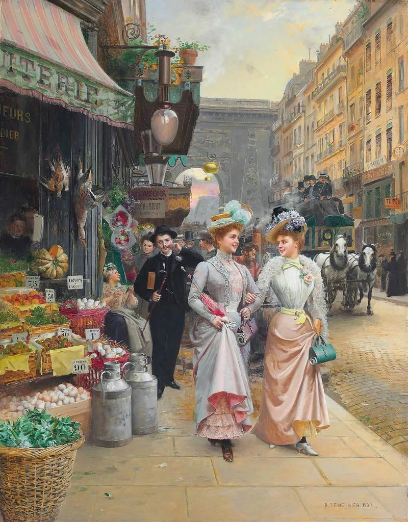 Basile Lemeuniers verk utmärker sig genom sin unika stil, en subtil blandning av realism och impressionism. De livfulla färgerna och de delikata texturerna gifter sig för att skapa en atmosfär som är både livfull och lugnande. I "Eleganta på promenad" är karaktärerna avbildade med särskild uppmärksamhet på kläddetaljer, vilket framhäver en epoks mode. De lätta klänningarna och hattarna prydda med blommor verkar dansa i vinden, medan bakgrunden är suddig och framkallar ett stadslandskap fyllt av mjukhet. Detta konsttryck nöjer sig inte med att skildra en scen; det väcker en känsla, en känsla av frihet och lätthet, och uppmuntrar betraktaren att känna av stundens skönhet. Kompositionen, noggrant balanserad, drar till sig blicken och inbjuder till en förlängd reflektion, vilket avslöjar djupet och rikedomarna i Lemeuniers konstnärliga universum.