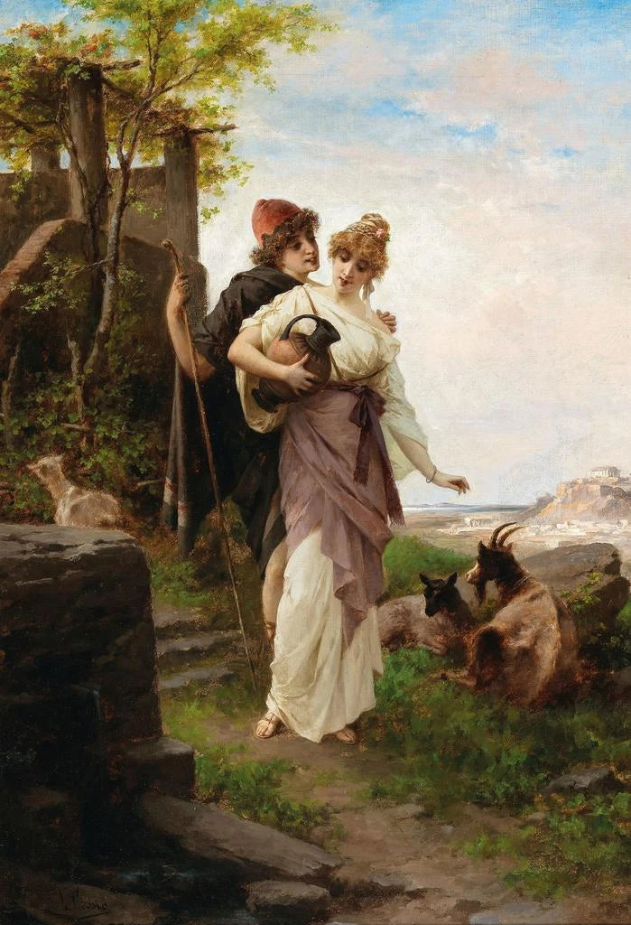 I denna konsttryck av verket "En scen bucolic nära fontänen" fördjupar Luigi Crosio oss i en pastoral värld där naturen och mänskligheten samexisterar harmoniskt. Kompositionen domineras av mjuka och naturliga nyanser, som framkallar en känsla av lugn under en solig eftermiddag. De noggrant utarbetade detaljerna av figurer, blommor och det glittrande vattnet i fontänen skapar en rofylld, nästan meditativ atmosfär. Varje element verkar berätta en historia och bjuder in betraktaren att fördjupa sig i detta ögonblick av fred och skönhet.