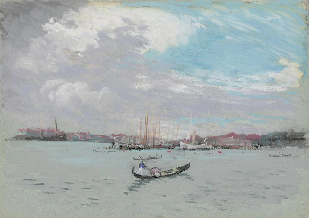 "En Dehors de Venise" de Joseph Pennell capture la magie des canaux de la célèbre ville italienne, offrant une perspective unique sur son architecture emblématique. La toile se distingue par ses couleurs vibrantes et ses lignes fluides, qui évoquent le mouvement des gondoles glissant sur l'eau. Pennell, avec son style distinctif, utilise des techniques de gravure et de peinture pour créer une atmosphère à la fois dynamique et nostalgique. L'œuvre invite le spectateur à s'immerger dans l'essence même de Venise, où chaque coup de pinceau semble raconter une histoire de voyage et de découverte.