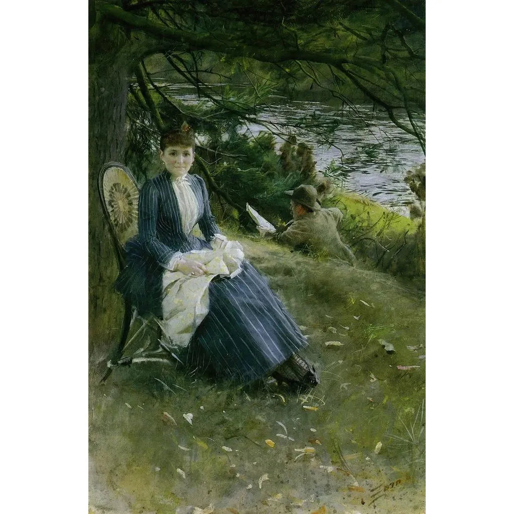 Anders Zorn, född i Sverige 1860, är en av de mest inflytelserika konstnärerna i sin tid, erkänd för sin förmåga att fånga ljus och mänskliga känslor. Hans stil, som pendlar mellan realism och impressionism, har formats av hans resor och möten med andra europeiska konstnärer. Zorn har etablerat sig på den internationella konstscenen, särskilt genom sina porträtt och genrebilder. En Écosse Madame Symons vittnar om hans talang att skildra vardagslivet med en touch av poesi och romantik, samtidigt som den hyllar skönheten i naturliga landskap.