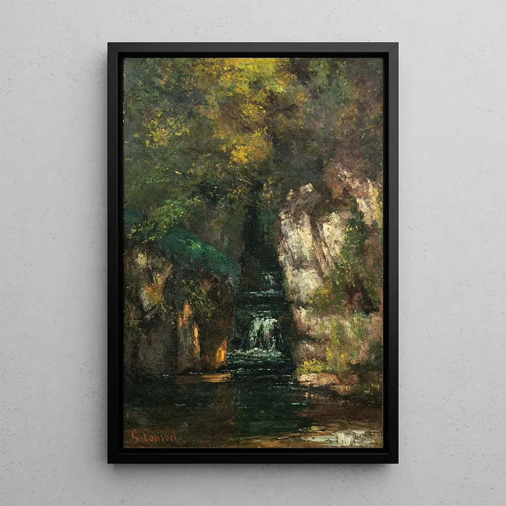 En konsttryck av "En vattenfall nära Ornans" av Gustave Courbet är ett verk som fångar naturens majestät genom vattnets rörelse. De gröna och bruna nyanserna, kombinerade med vita inslag, framkallar scenens friskhet och vitalitet. Courbet, mästare av realism, använder en måleriteknik som ger en känsla av djup och dynamik. Vattenfallet, i centrum av kompositionen, verkar spruta ut från duken och bjuder in betraktaren att känna naturens lugna kraft.