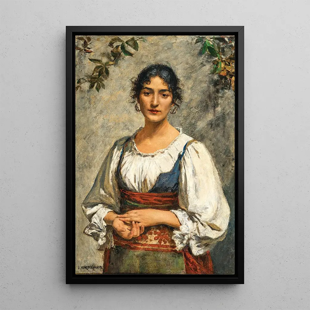 Johann Victor Krämer, en tysk konstnär från 1800-talet, är känd för sin förmåga att fånga själen hos sina motiv genom livfulla och uttrycksfulla porträtt. Påverkad av romantikens rörelse, specialiserade han sig på att avbilda kvinnliga figurer, ofta hämtade från olika kulturer, vilket vittnar om hans öppna sinne och intresse för världen. Hans verk utmärks av noggrann uppmärksamhet på detaljer och en färgpalett som både framkallar värme och djup. "Une femme sicilienne" är en del av denna tradition, som avslöjar vikten av kulturell identitet i hans konstnärliga arbete.