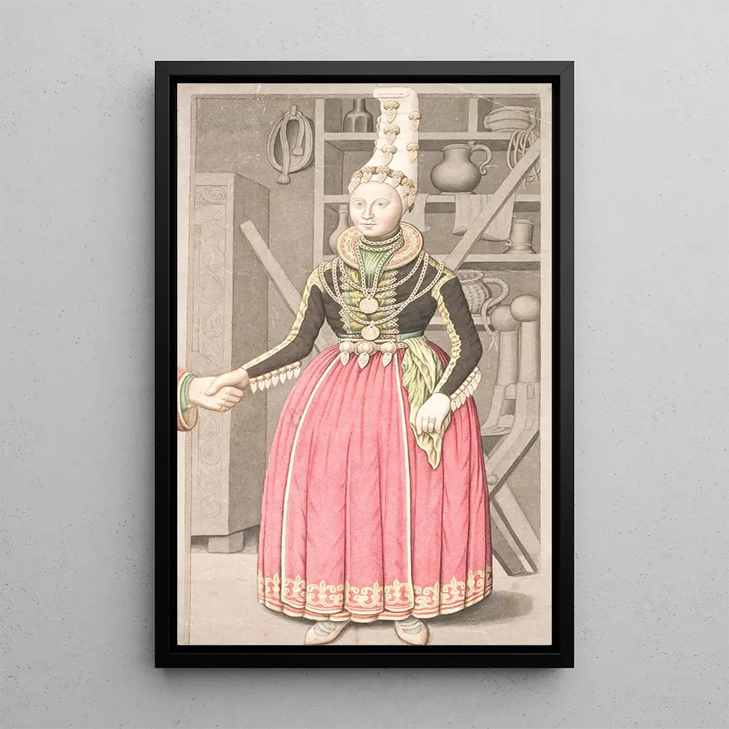 Denna konsttryck, En ung kvinna i brudklänning, framkallar en atmosfär fylld av ömhet och lugn. Kompositionen lyfter fram en ung kvinna klädd i en traditionell dräkt, vars noggrant utarbetade detaljer och pastellfärger skapar en fängslande visuell harmoni. De mjuka nyanserna av vitt och rosa, kombinerat med gröna inslag, förstärker känslan av friskhet och förnyelse. Tekniken, troligen oljemålning, gör det möjligt att återge texturerna på tygerna och ljusreflexerna på ett nästan taktilt sätt, vilket fördjupar betraktarens upplevelse av ett ögonblick av nåd och firande.