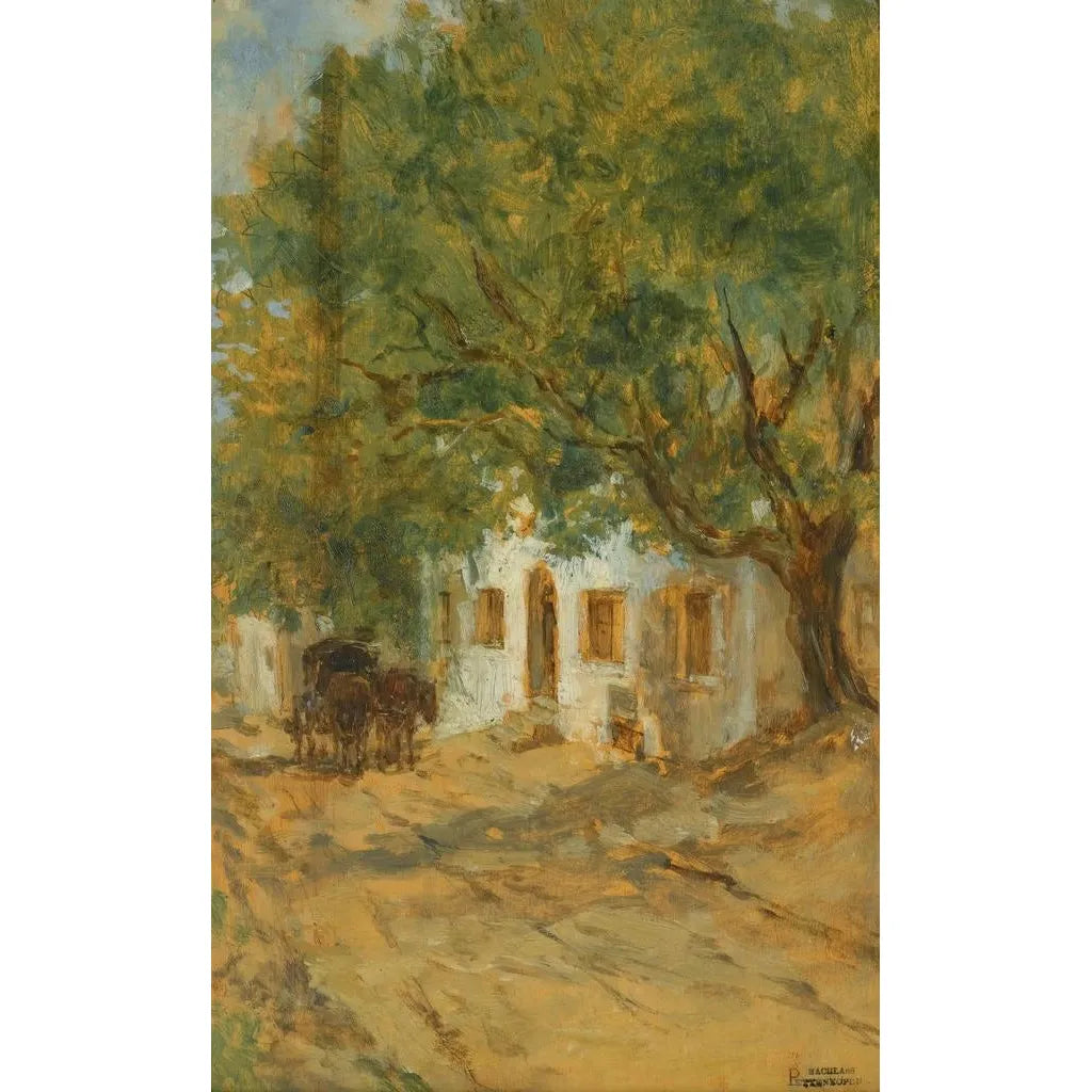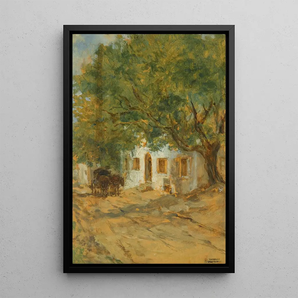 I "En gata i en by" fångar August von Pettenkofen essensen av en lugn vardag, där ljuset leker på husfasaderna och där figurerna verkar bli levande under betraktarens blick. De varma och jordnära färgerna framkallar en välkomnande atmosfär, medan oljemålningstekniken ger liv åt detaljerna, från gatstenar till trädens skuggor. Denna konsttryck inbjuder till en mjuk eftertanke, där varje element berättar en historia, och där tiden tycks stå stilla, vilket ger en inblick i en förgången tid.